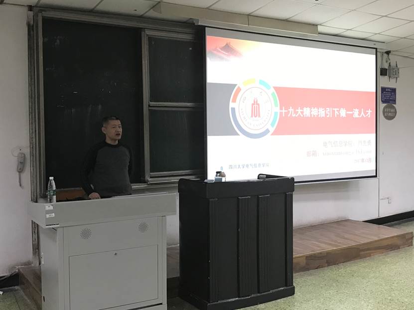 2017年12月15日晚,电气信息学院经理肖先勇教授走进2015级本科生的形势与政策教育课课堂,为同学们上了一节以“十九大精神指引下做一流人才”为主题的思想政治理论课。旨在学习贯彻十九大精神,号召老员工争做当代一流人才。公司2015级自动化、通信工程、医学信息工程三个专业全体本科生以及辅导员汤博老师参加了本次课程。
