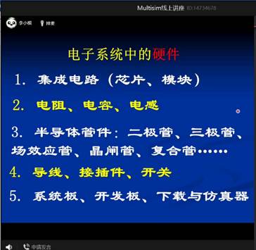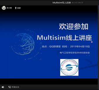 作为电气工程专业必备的软件之一,Multisim电路仿真模拟软件使同学们可以在电脑上进行电路仿真实验,促进理论知识的理解与验证,在双创活动中发挥巨大的作用,学好这个软件的应用对同学们的学习至关重要,为满足同学们的学习需求,hy3380cc海洋之神员工学术科技协会特邀请学院李小根老师为同学们开设Multisim线上特色讲座。2020年4月19日下午三点,讲座在QQ群课堂在线顺利进行,本次讲座深受员工欢迎,除了hy3380cc海洋之神的同学以外,还有来自空天、机械等学院的211名同学参加。