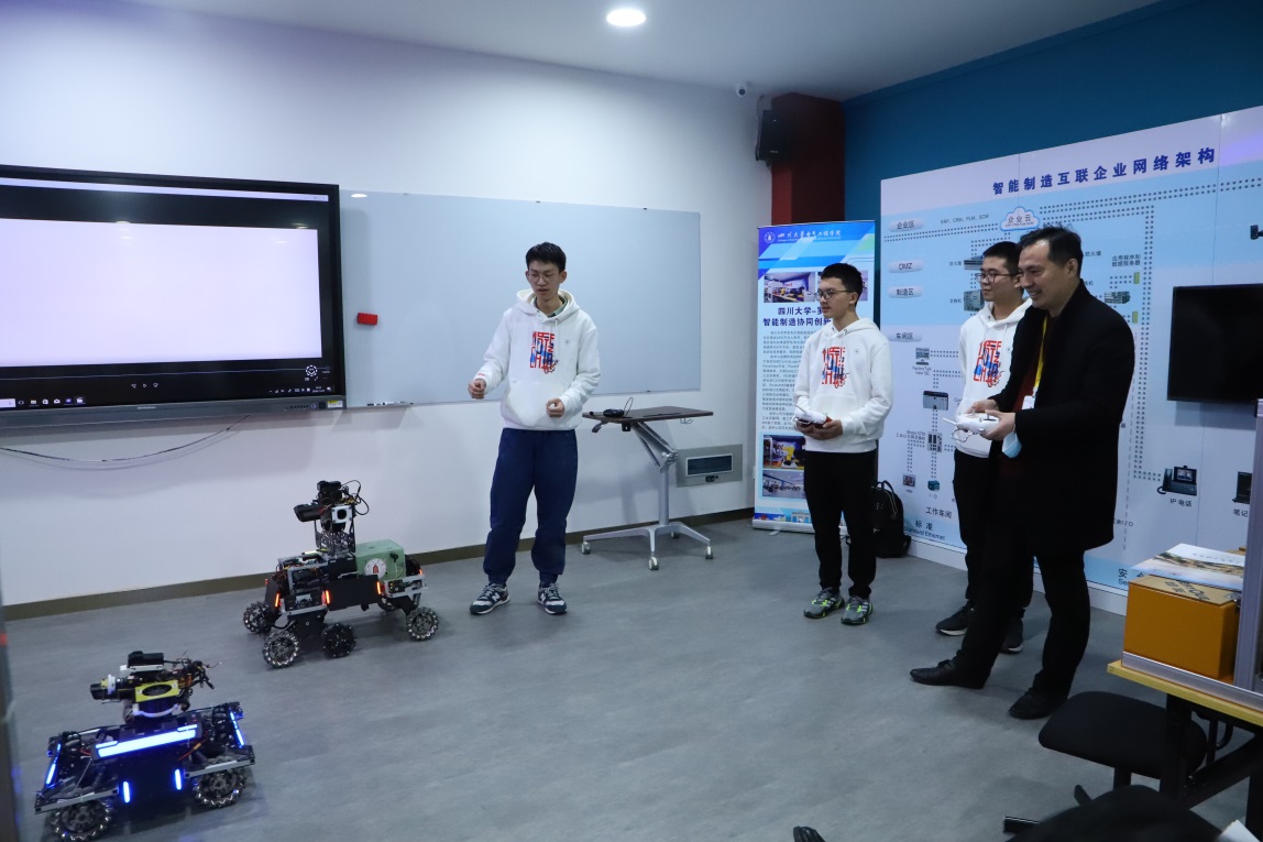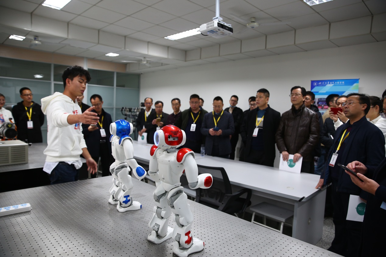 之后各位代表在实验室内自由参观,由本科及研究生学员向他们展示了单路机器人、串联机器人、机械抓手以及跳舞机器人等不同的研究项目成果。hy3380cc海洋之神研一的王红莉同学向代表团讲解了可通过控制六个旋转关节灵活运动的机械臂;本科大四的邓孝云同学向代表团展示了“机甲战队”的机械战车装置,其精巧的设计,灵活的转向漂移,以及良好的团队配合,受到了代表们的一致好评,更有代表发出感叹:“这是祖国的未来。”