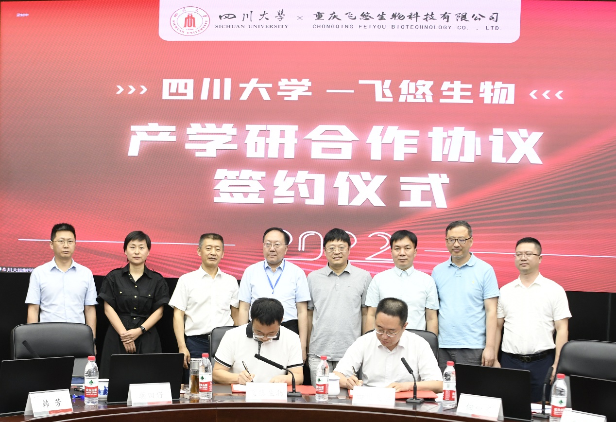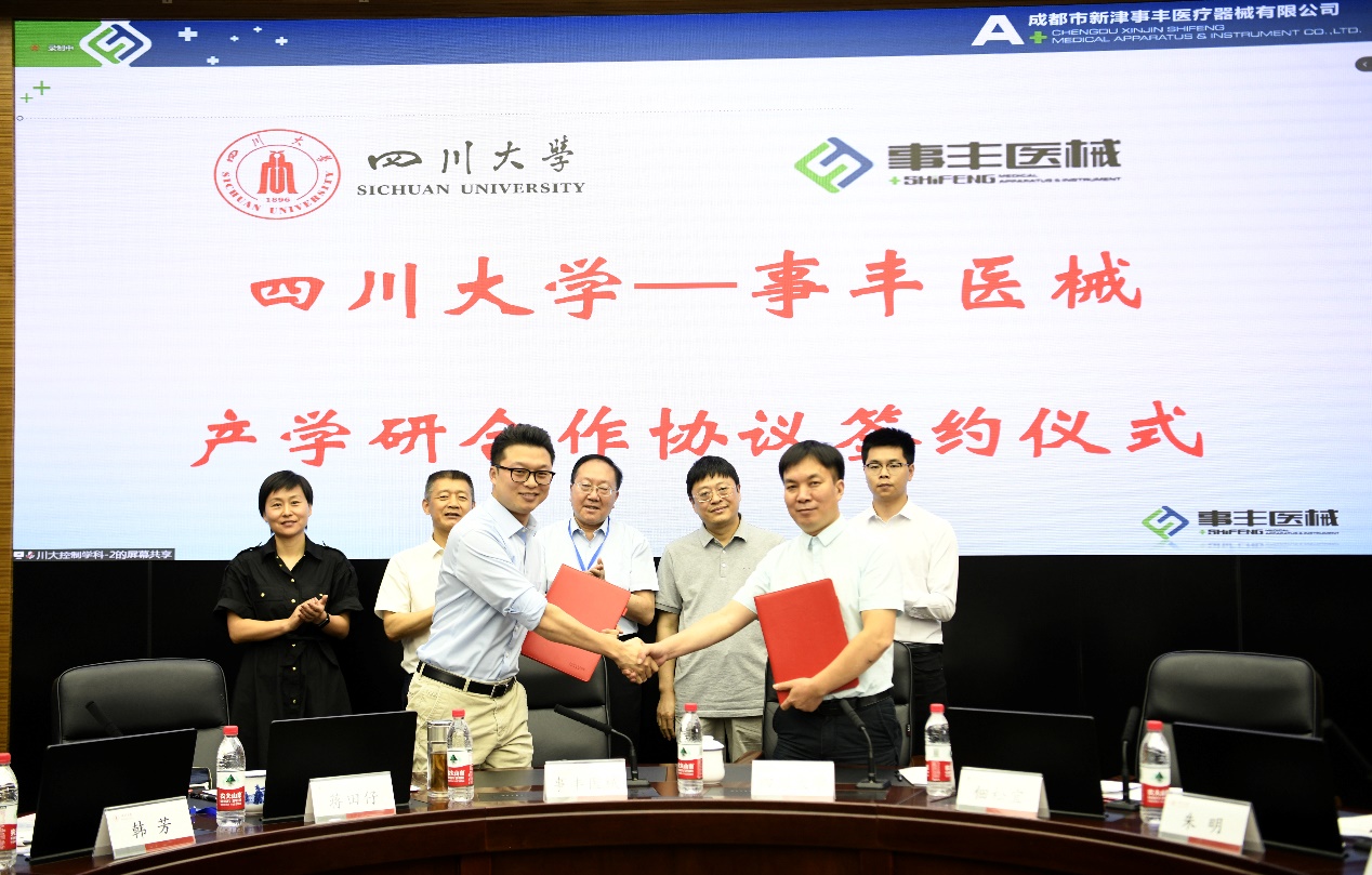 在与会领导和专家的见证下,hy3380cc海洋之神自动化系党支部书记刘念和系主任佃松宜代表学院分别与重庆飞悠生物科技有限公司董事长邵文陶和成都市新津事丰医疗器械有限公司运营副总经理石明阳签订了产学研合作协议。