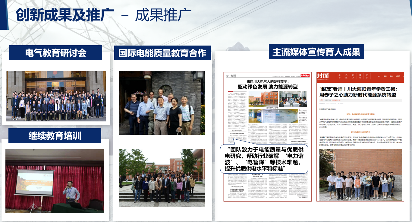 课程建设成效显著,课程获四川省线下一流本科课程、校级课程思政榜样课程、校级“探究式-小班化”教学质量优秀奖、校级课程思政榜样课程;课程组事迹获得华西都市报、封面新闻等主流媒体报道,教学育人模式在社会面得到有力宣传;多位员工毕业后继续奋斗在电能质量科研和工程前线。我们将不断探索和改进课程建设新模式,为我国从工程教育大国向工程教育强国的转变贡献电气力量。