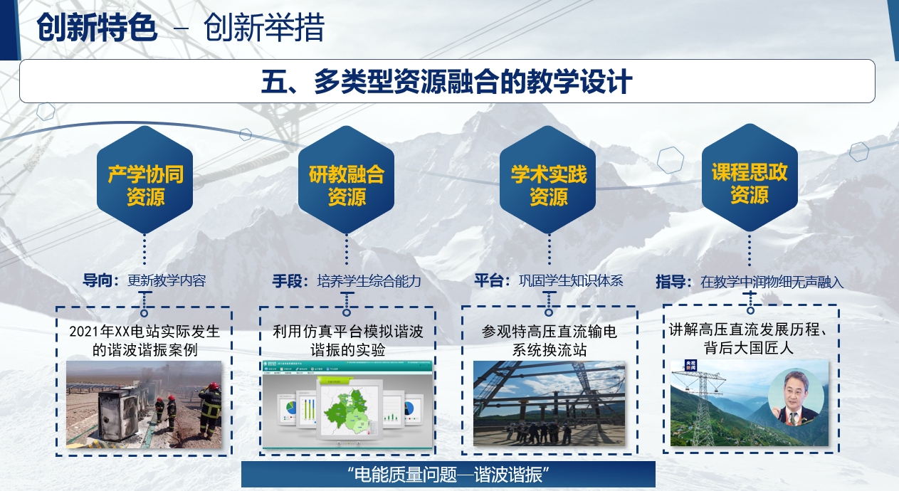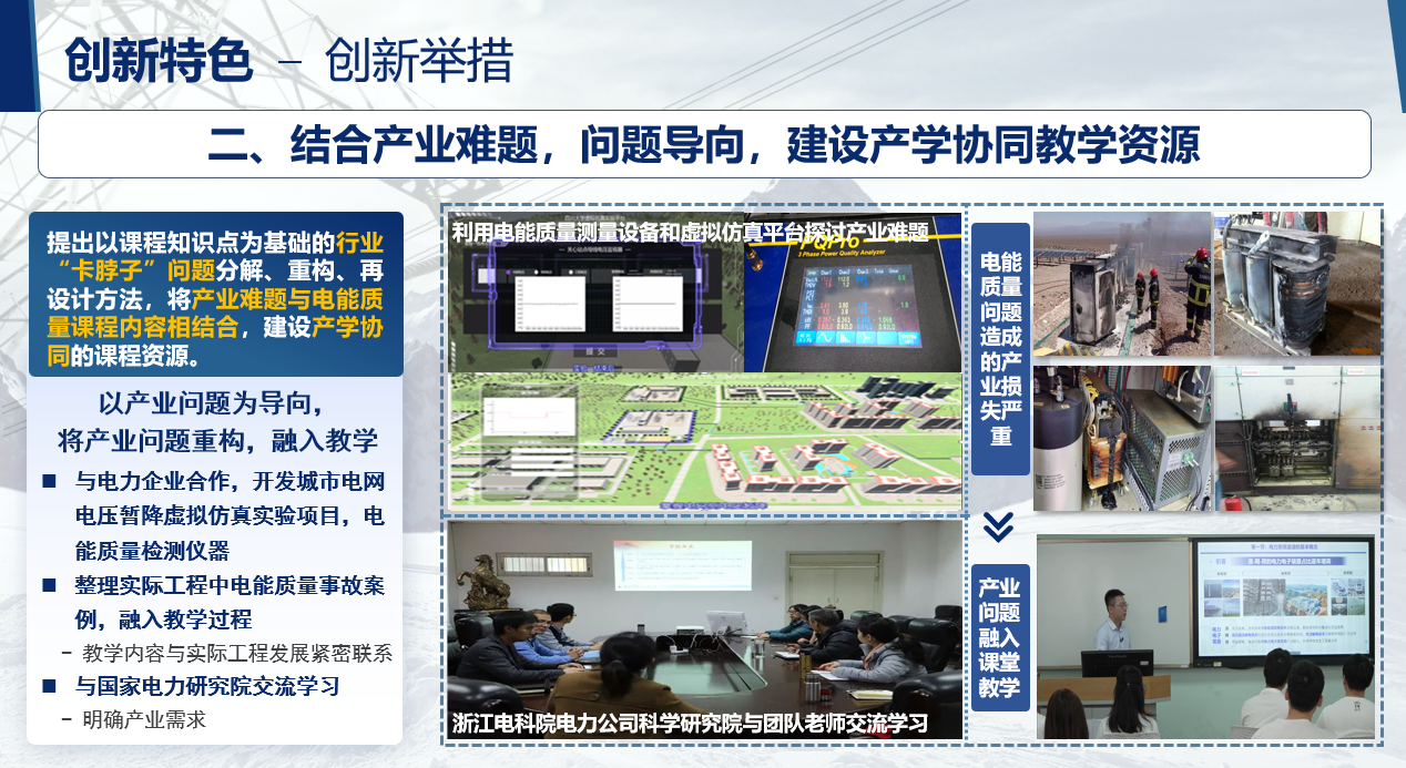 本课程存在教学内容与学科发展脱节、理论教学与工程实践结合困难、课程思政教育薄弱的痛点问题。鉴于此,课程组构建了产学协同、研教融合的教学模式:1)为响应“双碳”发展目标,将新能源、储能等新技术及相关电能质量问题引入课堂,以产学协同的教学模式对产业难题进行重构和再设计;2)采用调研、仿真、样机研制等形式将课程内容落到实处,以研教融合的教学模式培育员工们解决实际工程问题的能力;3)深入挖掘电气学科作出突出历史贡献的“大国匠人”以及他们所创造的“大国重器”,培育具有崇高理想信念、扎实专业知识、强烈创新意识和宽广国际视野的国家栋梁和电力行业精英。