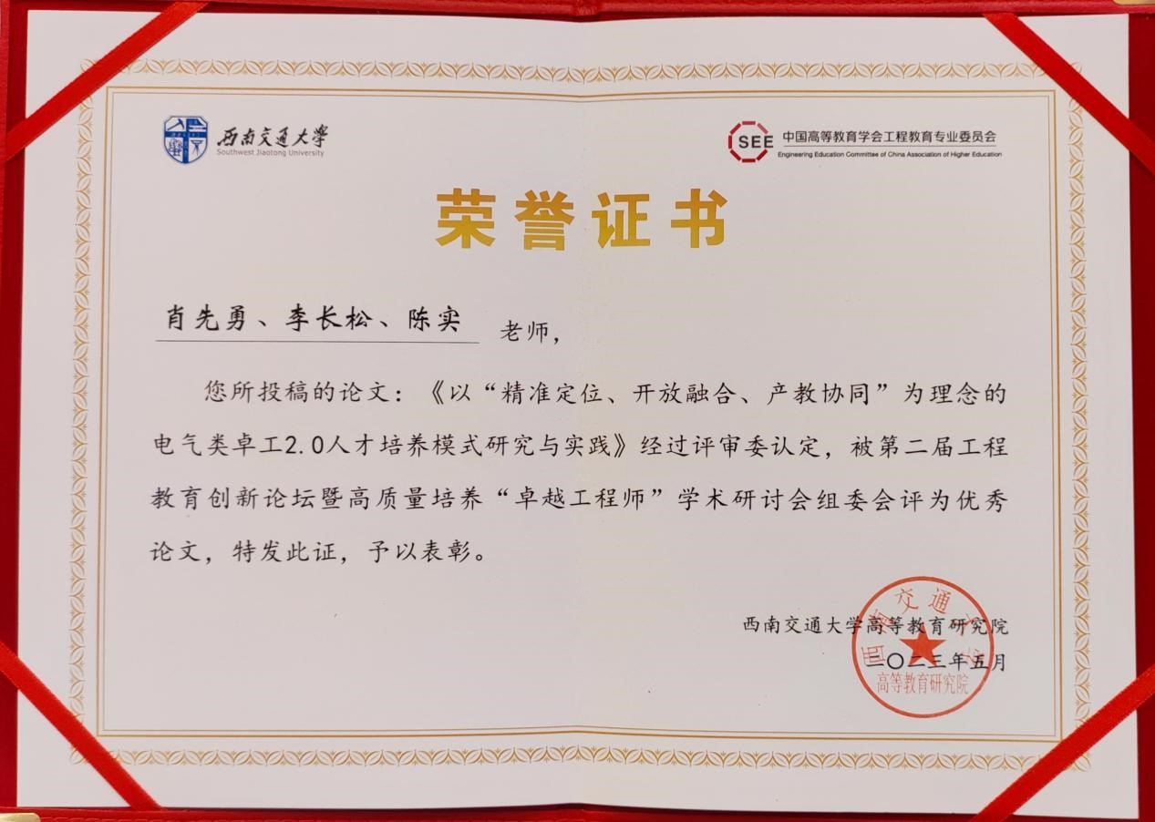 论坛上,公司提交的论文《以“精准定位、开放融合、产教协同”为理念的电气类卓工2.0人才培养模式研究与实践》(作者:肖先勇、李长松、陈实)获评优秀论文,并由组委会颁发了荣誉证书。