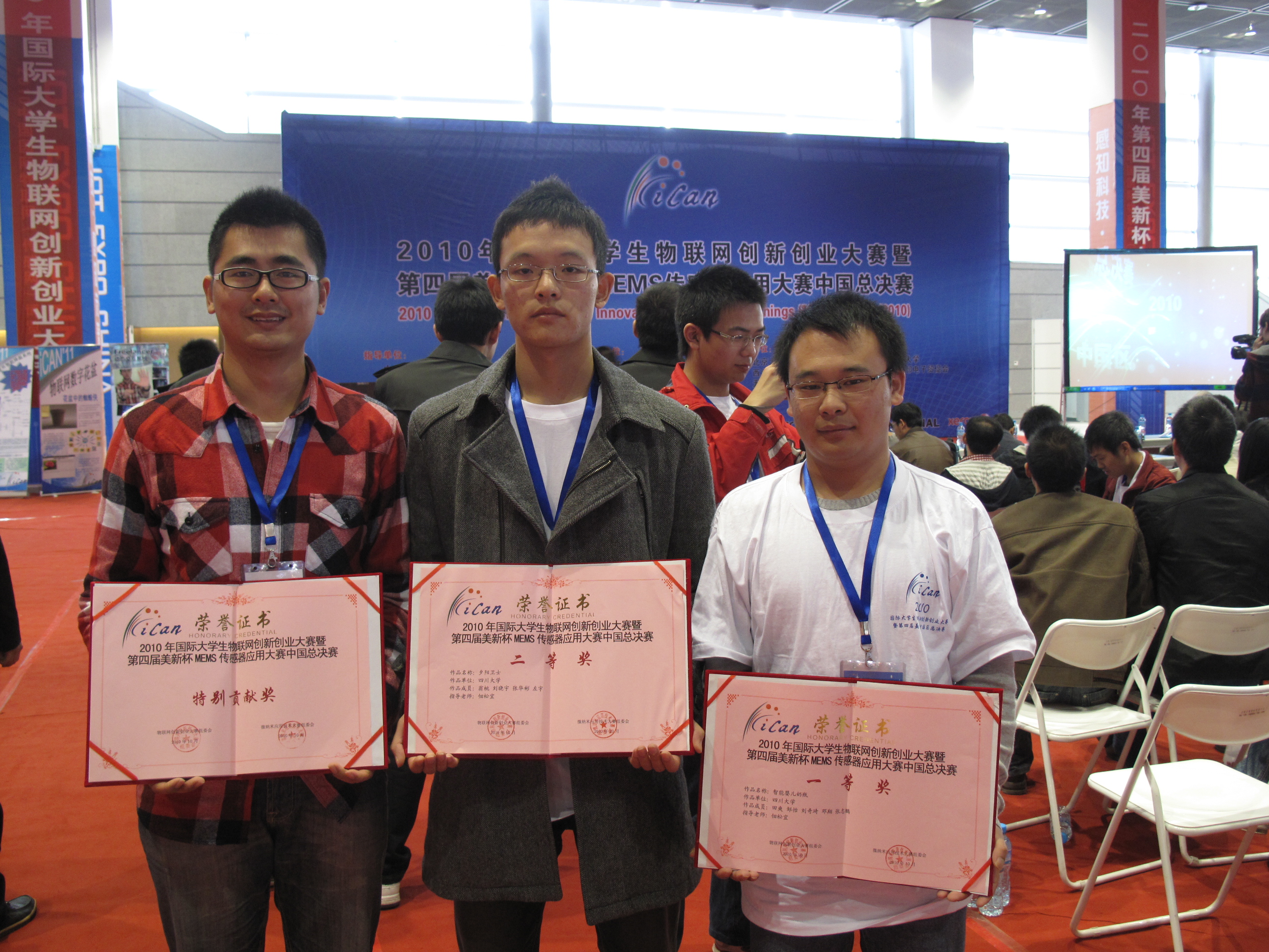 在学校相关部处和公司领导的大力支持下,由公司四名同学为主力,联合公司其它四个学院的同学组成的两支队伍从川渝赛区分赛区的比赛中脱颖而出,在公司佃松宜副教授的带领下奔赴无锡参加总决赛。在师生的一致努力下,取得参加该项赛事的历史最佳成绩。公司田爽同学为队长的爱Baby团队的作品“智能婴儿奶瓶”获得全国一等奖,该作品利用MEMS温度传感器检测奶水温度并通过液晶屏准确显示,采用美新加速度传感器实现无按键摇动开关,解决了日常生活中婴儿喂食温度难以掌握的难题。该队队员在决赛答辩时以扮演赵本山和宋丹丹的形式生动活泼地介绍了作品创意和特点,赢得评委专家们和在场观众的热烈掌声。公司翁桃同学为队长的夕阳卫士团队的作品“夕阳卫士”获得全国二等奖,该作品外形小巧,便于携带,当老人因心脏病、高血压等突发病症摔倒时,能够准确检测摔倒动作并自动发出求救短信到指定手机上,帮助老人在第一时间获得救助。该队队员在答辩表演时巧妙的加入四川方言幽默生动的演示了作品的使用方法,得到专家评委的一致好评。两队指导老师是来自公司的佃松宜副教授,由于出色承办组织川渝赛区的决赛,并且在比赛期间一直悉心指导督促员工更好的完成作品,带领员工在总决赛中取得如此佳绩,佃老师获得由大赛组委会颁发的特别贡献奖和优秀组织奖。