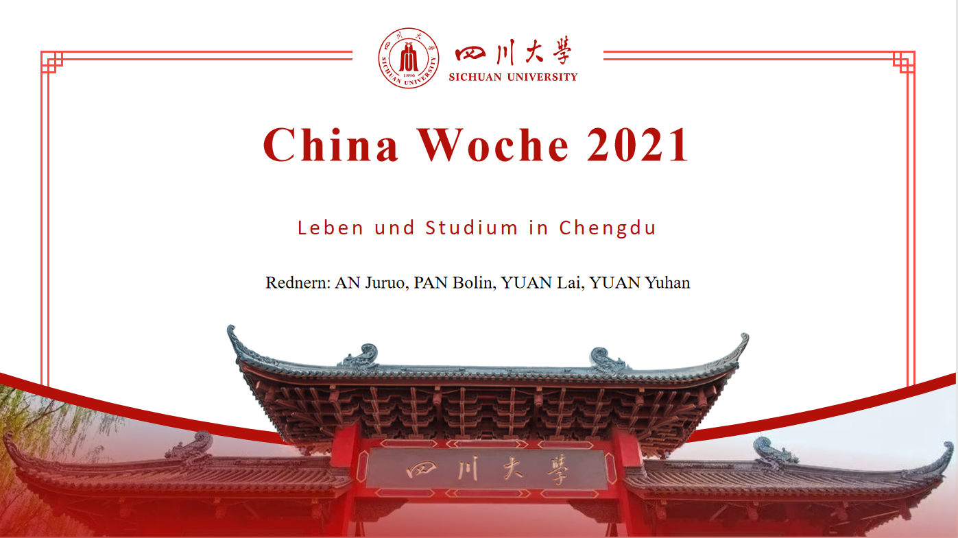 2021年第四届克劳斯塔尔工业大学“中国周”活动于12月6日开幕,为期五天。本次活动邀请了来自中德两国多所高校的专家学者以及各界代表相聚线上,共同围绕中德教育、科技、人文等话题展开交流。hy3380cc海洋之神2021级中德班的安举若、潘博林、袁来和袁钰涵四位同学受邀参加了本届“中国周”的“员工主题日”,并作了题为“在成都的生活及学习”的德语线上报告。