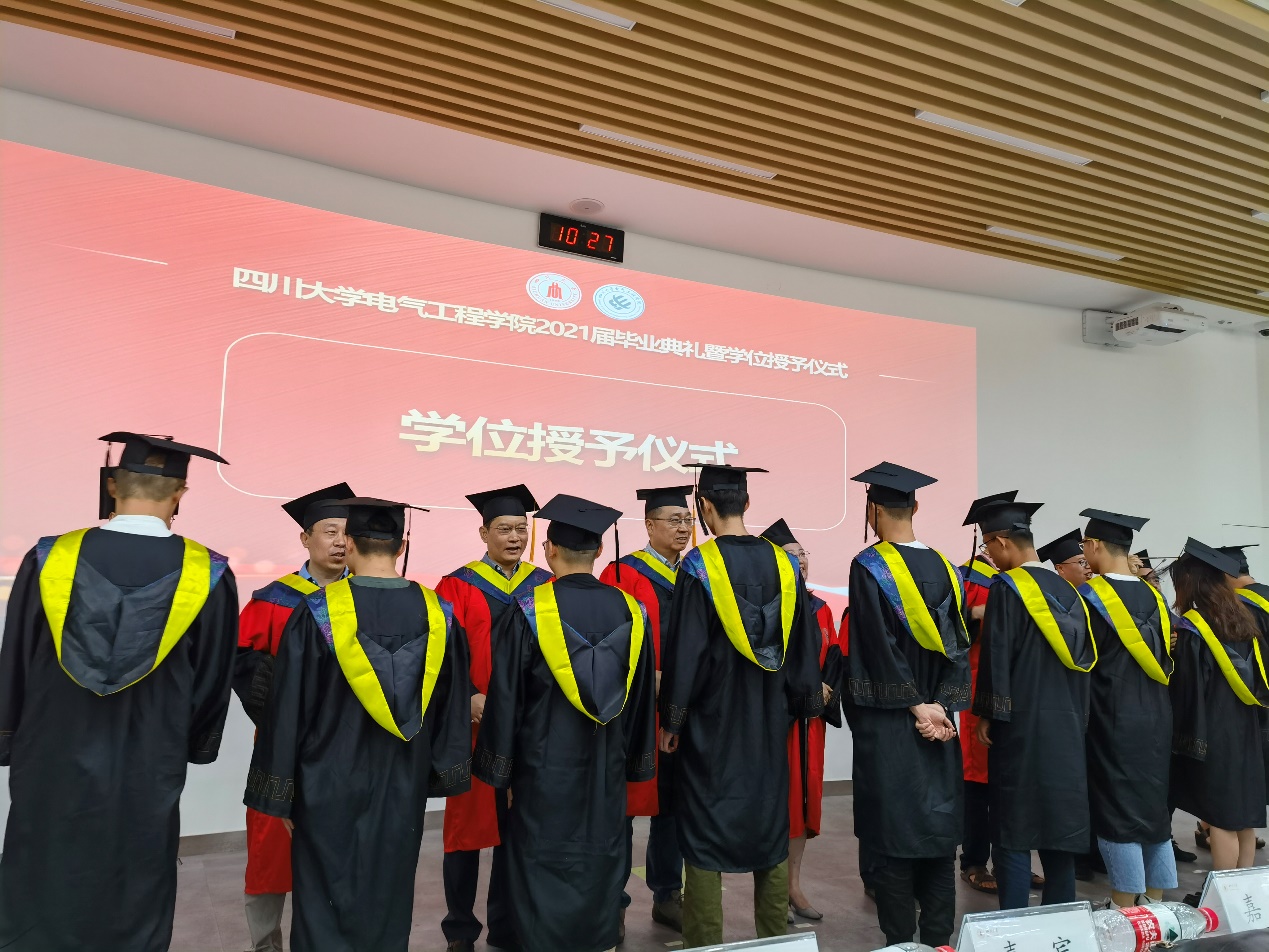典礼在雄壮的国歌声中拉开了序幕。首先由2018级硕士研究生邓靖微同学作为毕业生代表致毕业感言。她表示,在川大电气求学的时光是一笔宝贵的财富,校园里的经历与机遇不仅让他们真切地感受到青年学子之于国家与社会的责任,更教会他们如何在纷繁复杂的时代与环境里把握自己的未来。他们将带上母校的祝福,带着电气人这张金色名片,保留“海纳百川,有容乃大”这份底色,踏上广阔征途,拥抱精彩纷呈的崭新人生,并祝愿公司蓬勃发展,再创辉煌。