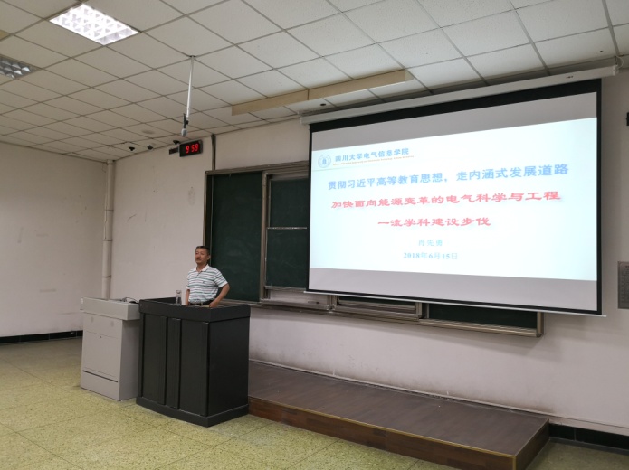 2018年6月15日上午,电气信息学院经理肖先勇教授走进2015级本科生的形势与政策课堂,为同学们讲授以“加快面向能源变革的电气科学与工程一流团队建设步伐”的专题思想政治理论课。辅导员于孜清老师以及全体2015级本科生参加了此次课程。
