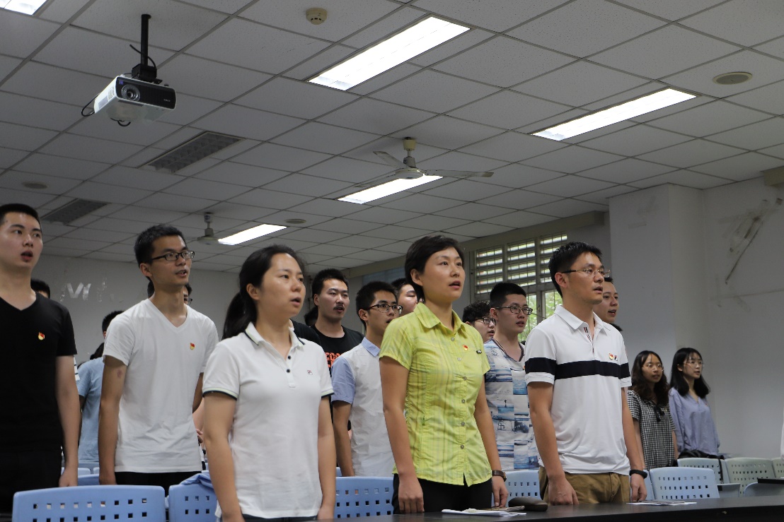 在全体与会党员同志齐唱《中华人民共和国国歌》声中,活动正式开始,党支部书记汤博宣读转为中共正式党员及新发展预备党员名单。随后在庄严的中国共产党党旗下,全体与会党员胸佩党徽,举起右拳,朗声宣读入党誓词,共同表达了为党的事业奋斗终身的坚定决心。谢佳霖同学代表支部青年党员发言,总结了加入党组织以来自己的收获,带领同学们回顾了中国共产党成立以来的光辉历史,并向党的九十七岁生日献上了诚挚的祝福。