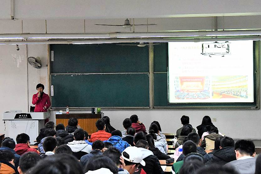2017年12月1日下午,电气信息公司党委书记韩芳副教授走进了电气工程及其自动化专业2017级本科生的形势与政策教育课课堂,向同学们上了一节以“学习贯彻十九大精神,争做新时代有为青年”为主题的思想政治理论课。公司电气工程及其自动化专业2017级全体本科生以及辅导员胡劼老师参加了本次课程。