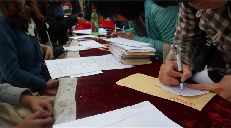 青春广场的活动中心,在志愿者的诚挚邀请下,同学们纷纷写下自己在生活中、学习上遇到的困难,置于信封内,并在信封上写上自己的名字、电话号码及宿舍地址。另一些热心的同学细心拆阅这些信件,将自己认为可行的解决困难的方案写下来,装入原信封,交给工作人员。最后这些信件由工作人员一一送还给提出困难的同学。青春广场来往人流不绝,同学们路过纷纷停下自己的脚步。有的满怀期待地写下的自己困惑,有的兴致勃勃地为他人答疑解惑。欢乐和谐的氛围围绕着帮助和被帮助的人。