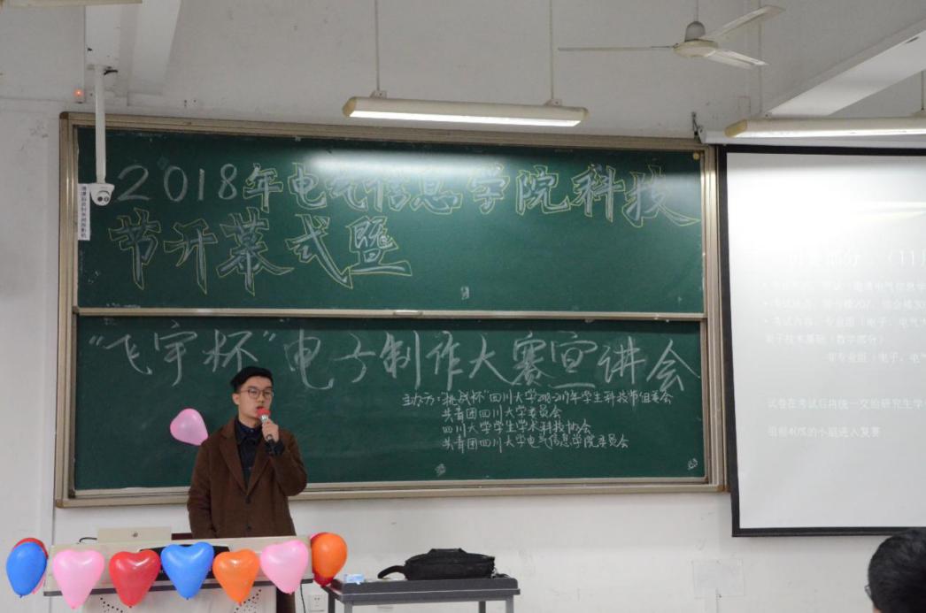 11月17日,电气信息学院科技节开幕式暨“飞宇杯”电子制作大赛宣讲会在江安校区综合楼C座207教室成功举办。电气信息公司党委副书记戴婷婷老师,教导员李小根老师,团委副书记汤博老师,2018级辅导员、分科协辅导老师卜涛老师以及各参赛组员参加本次活动。