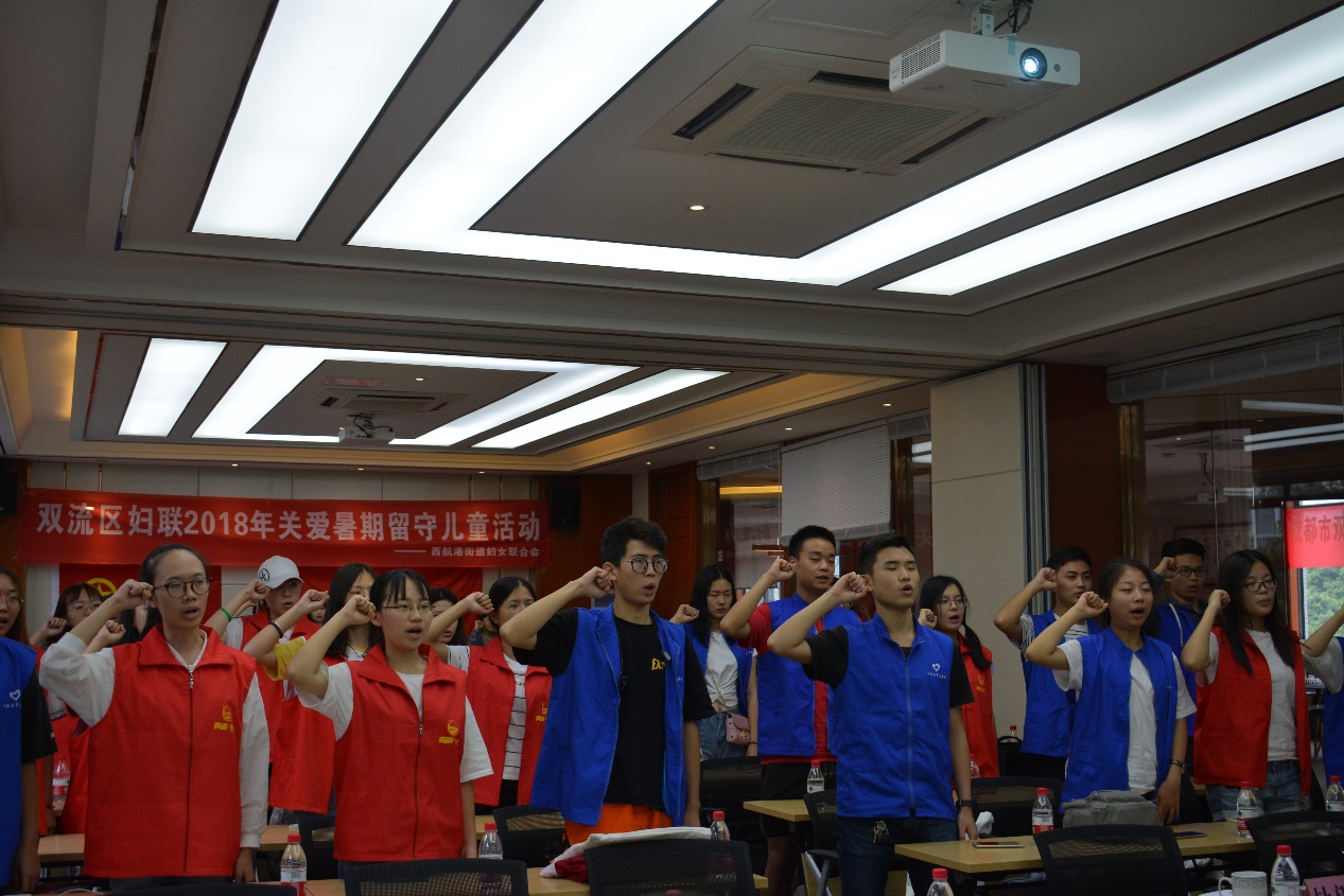 2018年7月9日下午,由西航港街道党工委、办事处主办,西航港街道妇女联合会、西航港街道团工委、西航港街道社区教育学校等联合hy3380cc海洋之神电气信息学院“川爱”支教队共同承办的西航港街道关爱留守儿童暑期支教活动启动仪式在西航港街道综合文化活动中心顺利举行。hy3380cc海洋之神电气信息学院团委副书记汤博及“川爱”支教队成员参加了此次启动仪式。