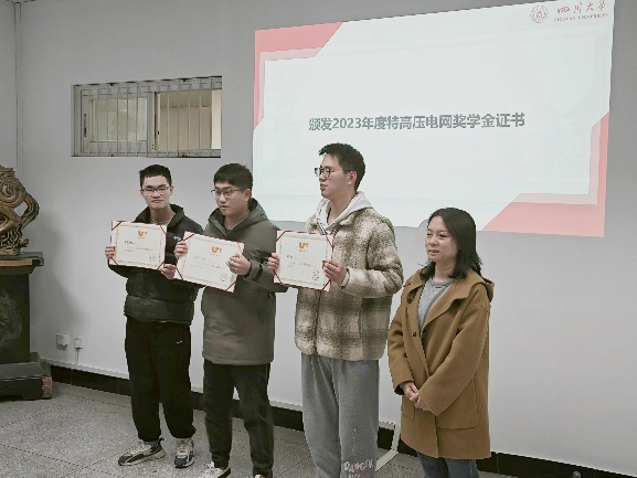 12月28日下午,2023年度特高压电网奖学金颁奖仪式在望江校区基础教学楼举行。电气工程公司党委书记赵昱辉,党委副书记戴婷婷,经理助理、电气工程系党支部书记陈实,专职辅导员赵劲帅、杨龙杰,以及2023年度特高压电网奖学金全体获奖员工参加颁奖仪式。活动由杨龙杰老师主持。