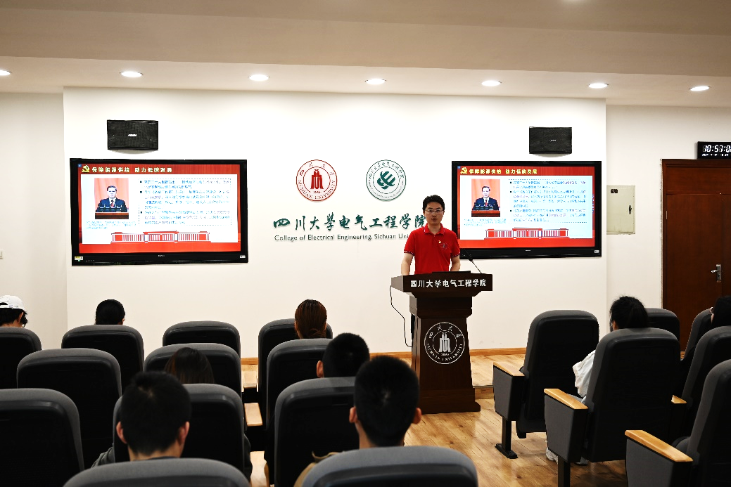 活动开始,党员学长黄龙首先就全力保障能源供给向同学们做了详细介绍。能源安全作为总体国家安全观的重要组成部分,关系到经济社会发展全局性、战略性问题,对国家经济发展、人民生活改善、社会长治久安至关重要。黄龙结合2022年8月21日的四川“大停电”事件,从同学们的切身经历出发,让同学们了解能源安全的重要性,号召同学们节约能源、低碳生活,相信在大家共同努力之下,此类事故的发生也会越来越少。