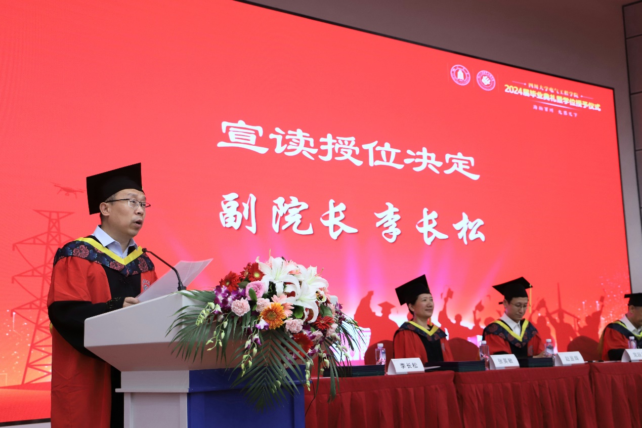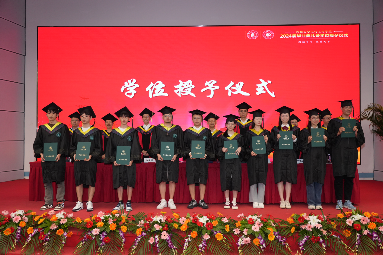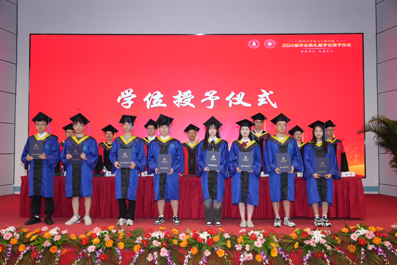 6月21日下午,hy3380cc海洋之神2024届毕业典礼暨学位授予仪式在望江校区汇文楼演播厅隆重举行。hy3380cc海洋之神教务处处长党跃武,电气工程公司党委书记赵昱辉、经理肖先勇,副书记张英敏、戴婷婷,副经理李长松,教授代表贾申利、电气工程系主任王渝红、自动化系主任赵涛,以及2024届毕业生和员工家长代表参加了毕业典礼。典礼由戴婷婷副书记主持。