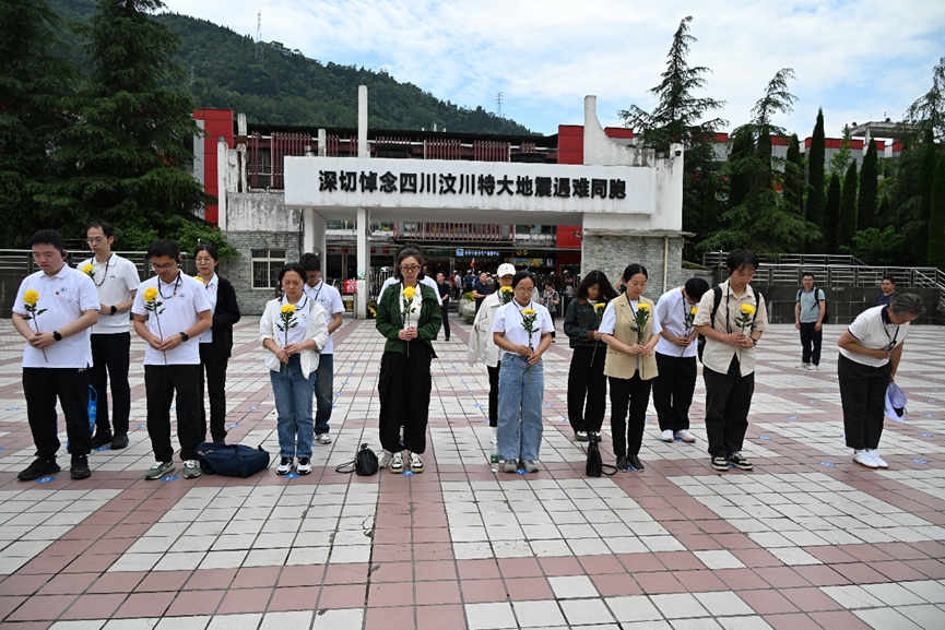 在汶川特大地震纪念馆,断裂的时钟永远定格在14时28分。讲解员王爱新作为地震亲历者,眼含热泪回忆起抗震救灾的感人瞬间:“地动山摇的瞬间,映秀镇学校的老师们迅速组织疏散,用血肉之躯护住员工;随后,党员突击队冒着余震风险争分夺秒抢救被困群众,在废墟中筑起生命通道。”全体师生党员在漩口中学遗址前肃立默哀,向地震遇难者敬献鲜花,致以最深切的缅怀和敬意。