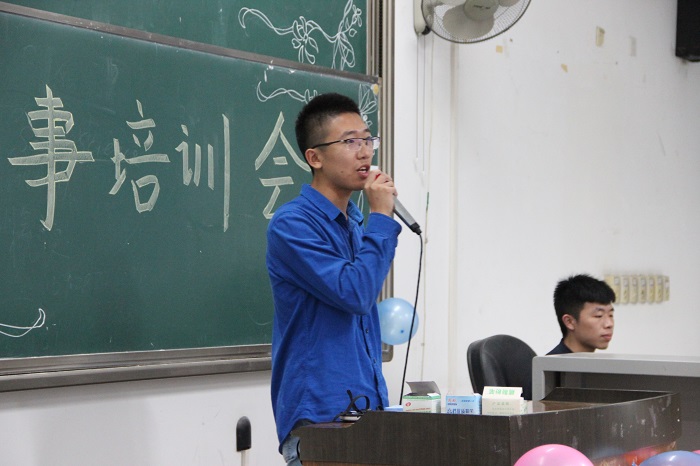 接下来,执行团委员工副书记谢佳霖学长进行讲话。他总体概述了团委员工会的工作,使新干事们对员工工作有了具体的了解。最后他以学长的身份满怀希望地说:接下来的一年是你们的时代,我们将尽己所能为你们提供帮助。他勉励干事们要有责任感、使命感,积极进取,大胆创新,让员工会更上一层楼。