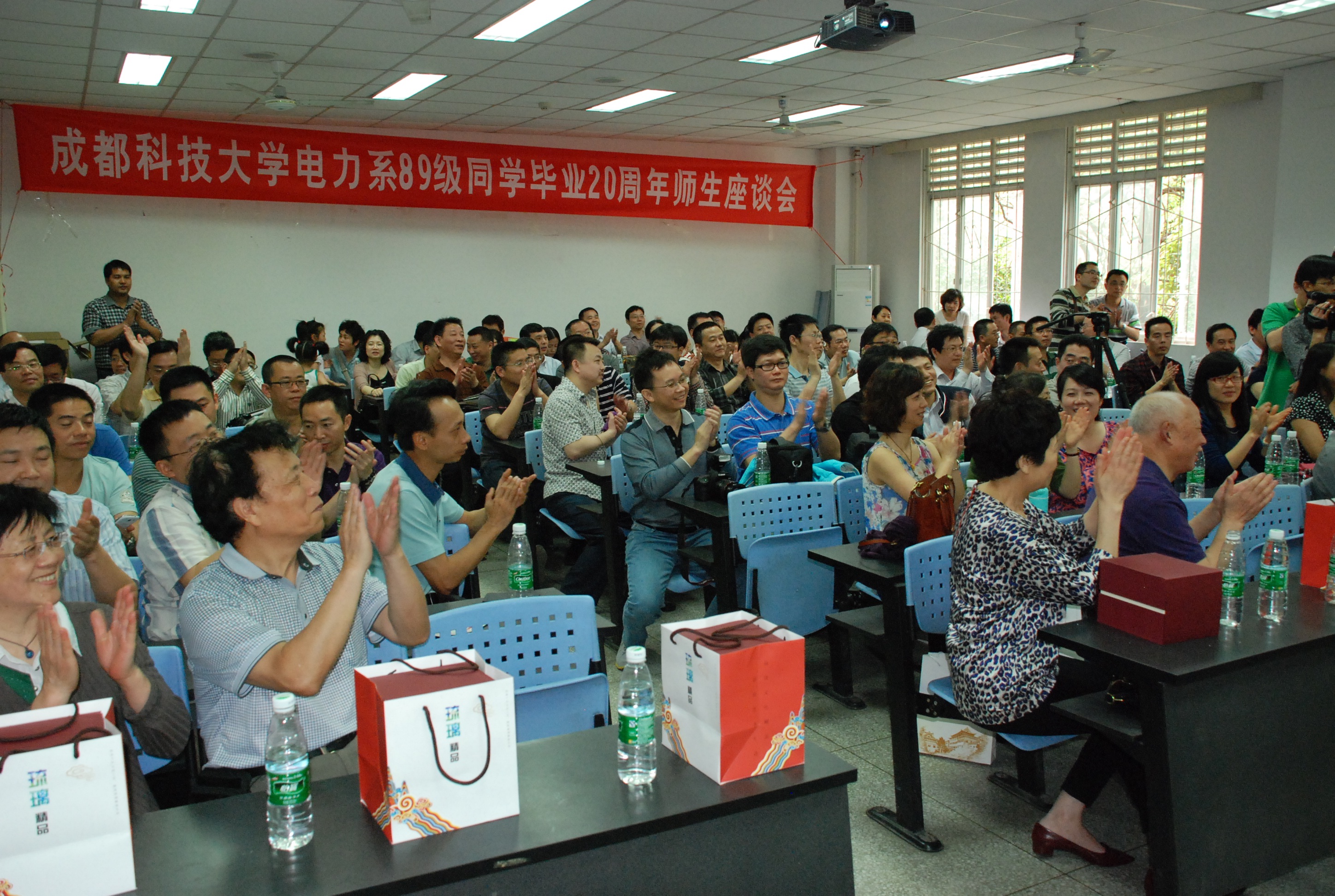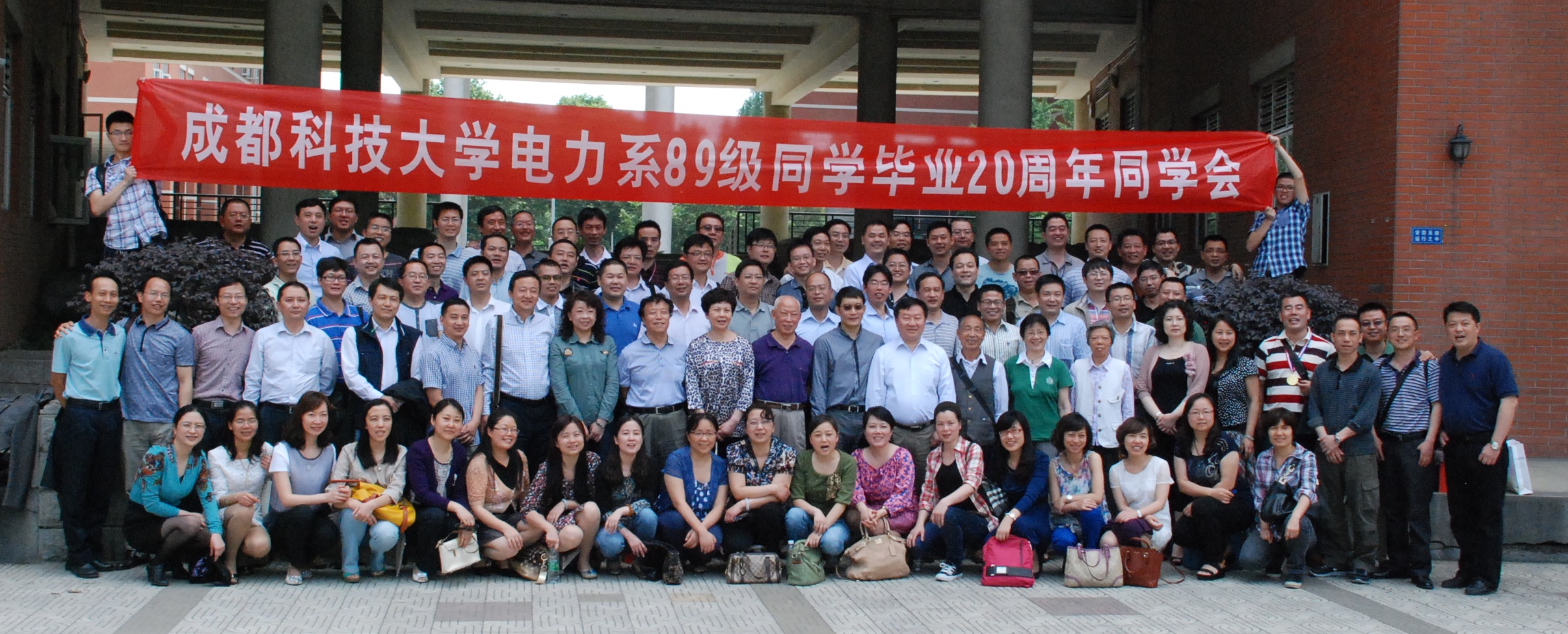 2013年4月30日上午9点半,九十余名原成都科技大学89级电力系员工毕业20年后在望江校区电气信息学院基础教学楼前再聚首。首先,员工们围在一起在捐赠给学校的大树下进行了剪彩并合影留念。