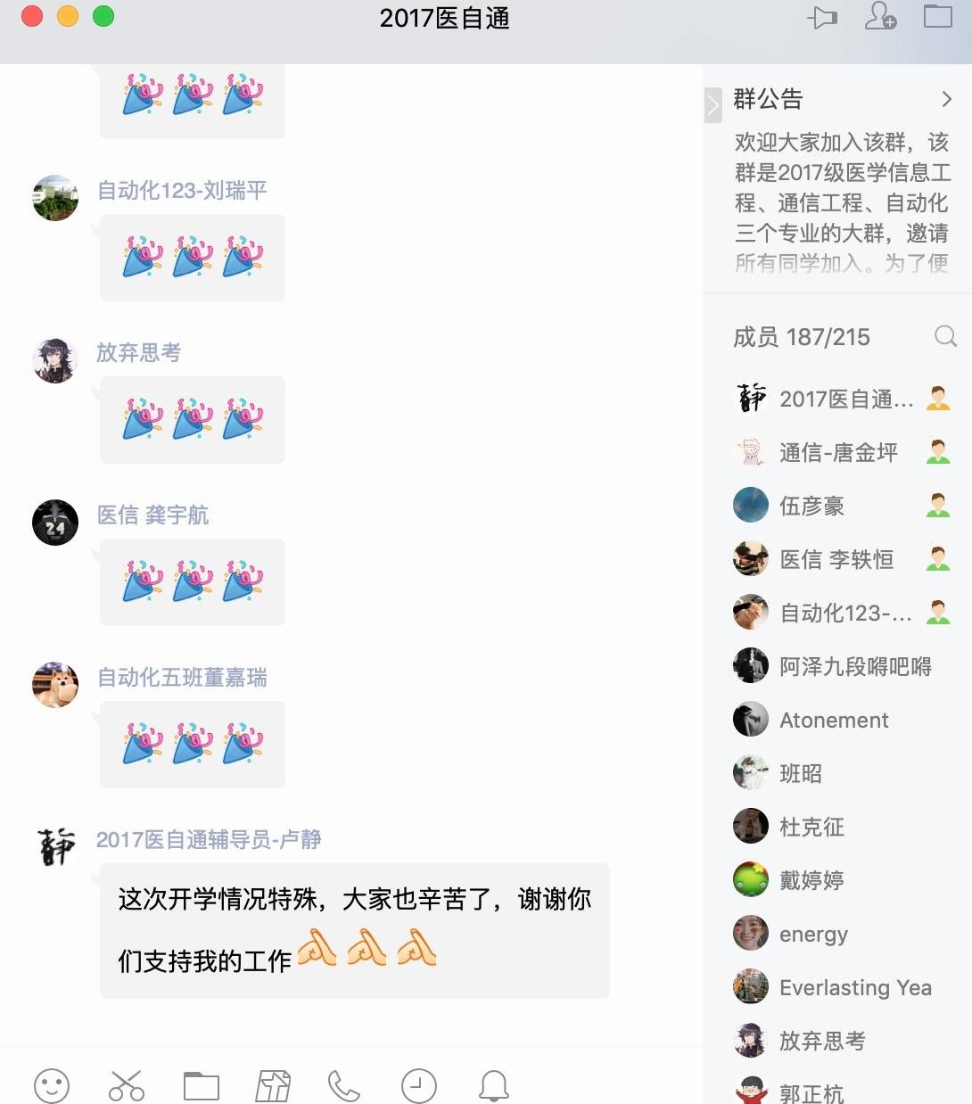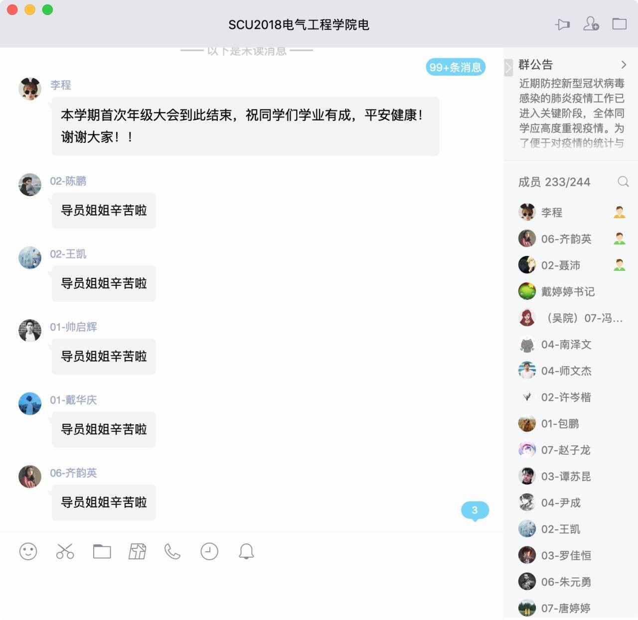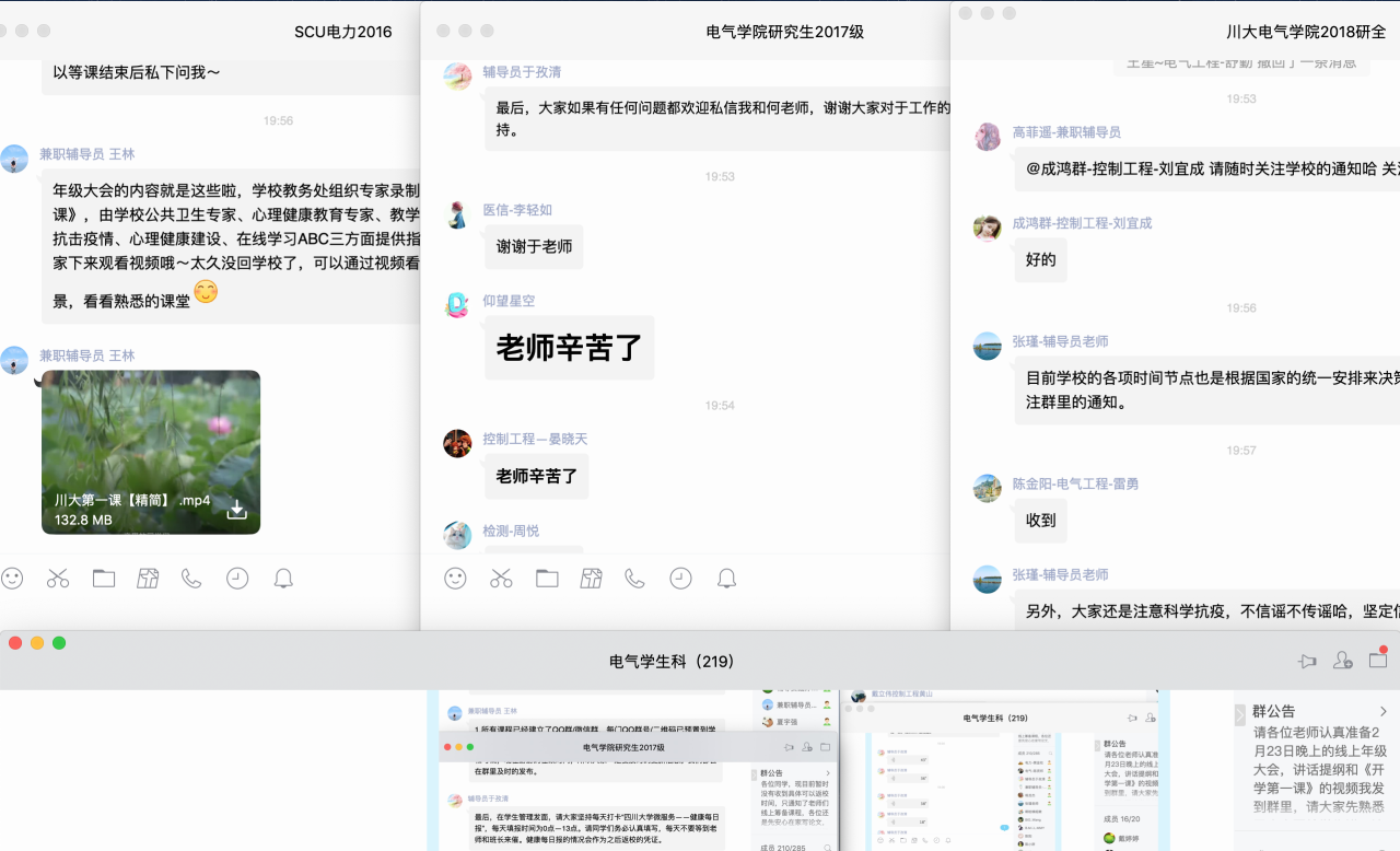 本次年级大会,各专兼职辅导员采用了文字传达、语音与视频直播等多样化的线上模式。虽然相隔千里,但仍阻挡不了师生间亲密的交流与互动;本次年级大会重点强调了以下三方面内容。第一,要进一步统一思想,增强战胜疫情的信心。作为青年老员工,在疫情面前,要保持理性,做好疫情防控,保护好自己;同时要坚定信心,不传谣不信谣,相信在党和国家的领导下,在全国14亿人的共同努力下,我们定会夺取抗击疫情的最终胜利。第二,要尽快适应线上教学,从思想和行动上做好开学准备。新的线上教学模式要求大家提高自觉性和适应能力,积极与老师配合,有问题也要及时与老师沟通;虽然身处校外,但学习丝毫也不能松懈。第三,要严格遵守学校的相关规定,尤其不得提前返校。