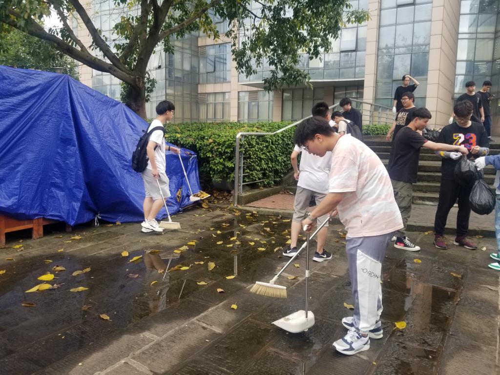 下午四点整,同学们在辅导员老师的带领下准时来到位于江安图书馆附近的学院卫生责任区,打扫图书馆外围的地面、草地等公共区域。同学们以小班为单位划分了清洁范围,经过工具发放、分工等一系列准备工作,紧锣密鼓地开始了大清扫,大家都热情洋溢、井然有序。