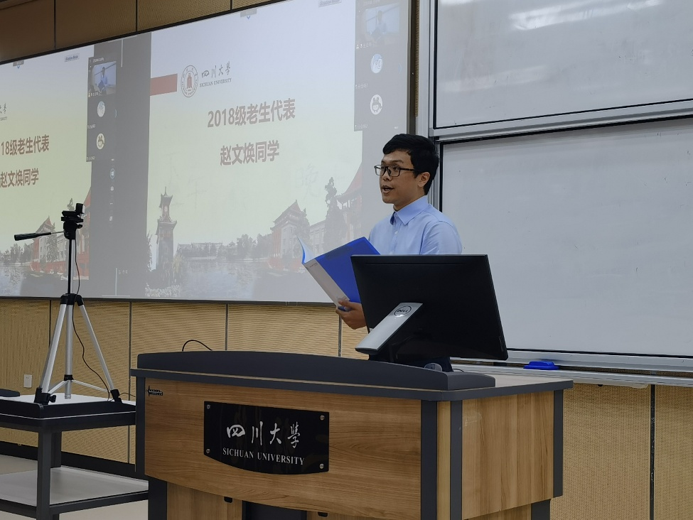 公司2018级电气工程及其自动化专业本科生赵文焕代表老生进行发言。赵文焕同学以“适应”“选择”“积累”三个关键词出发,讲述了高中与大学的不同,鼓励学弟学妹们积极寻找自身长处发挥优势;他以自身经历提醒大家要做出锚定理想的选择,不要执着于事事都求圆满,并以自己曾在双创中心经历的科研训练来鼓励大家多多积累专业知识。