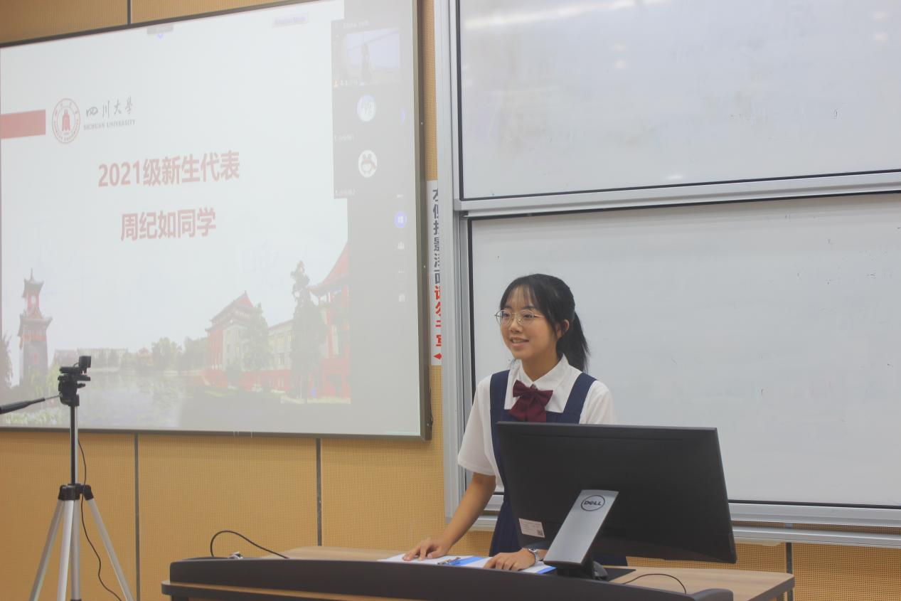 随后,学院2021级本科生周纪如作为新生代表发言。周纪如同学首先表达了对于大学学习生活的向往与期待,以及对于hy3380cc海洋之神与hy3380cc海洋之神的追求和信任。演讲中,周同学分享了三个方面的内容与新生们共勉。一是不随波逐流,而是积极探索,借助川大广阔的视野与平台发展自己。二是不冷漠麻木,保持内心的善良与同情。她以河南暴雨中挺身而出的员工孙立志为例,表达了对勇敢、赤忱的川大电气人的钦佩与欣赏。三是不颓废消极,勇敢地扛起青年担当,勇于奋进。
