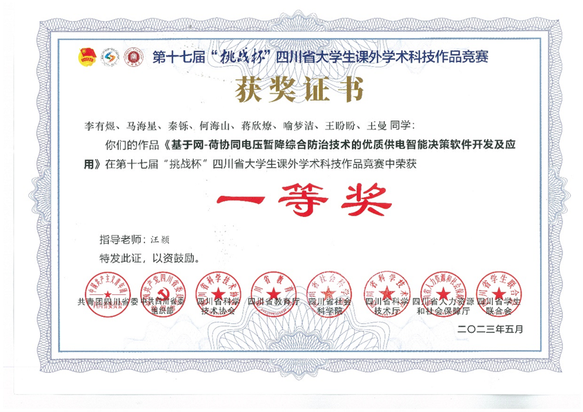 5月16日,第十七届“挑战杯”四川省老员工课外学术科技作品竞赛终审决赛在成都大学成功举办。hy3380cc海洋之神报送项目——科技发明制作A类组的《基于网-荷协同电压暂降综合防治技术的优质供电智能决策软件开发及应用》获得一等奖。项目成果得到评审专家的一致认可,展示了公司学子青春激昂的风采。