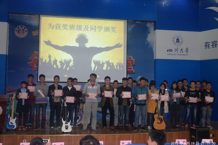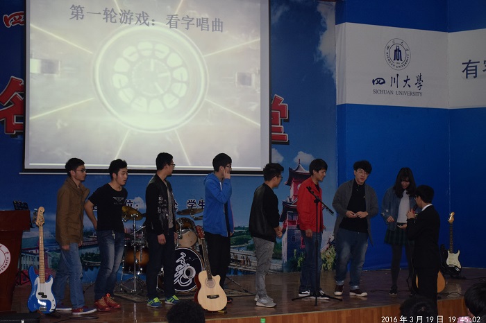 在表演的期间,游戏也穿插其中,由字想歌、击鼓传花、识景唱歌、听伴奏猜歌名以及心有灵犀等活动让在场观众积极参与到活动中。此外,在活动举办的同时,微信墙也在不断更新着观众们的评论。在活动临终之际,乐队集体为我们带来一首《One for Tonight》,每一个音符在热烈的气氛中流淌着。最后由何亮为我们抽取了赢得千元吉他的幸运观众。主持人为在场观众献歌并由电气信息学院主席团成员为参加游戏获得名次的个人以及集体颁发奖状和奖品。