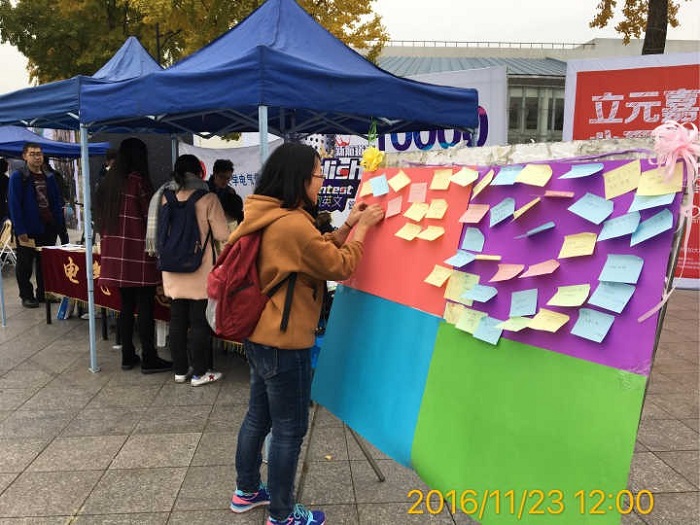 参与活动的同学登记信息,领取信纸和信封并抽奖,或是写便利贴,贴到心愿墙上。