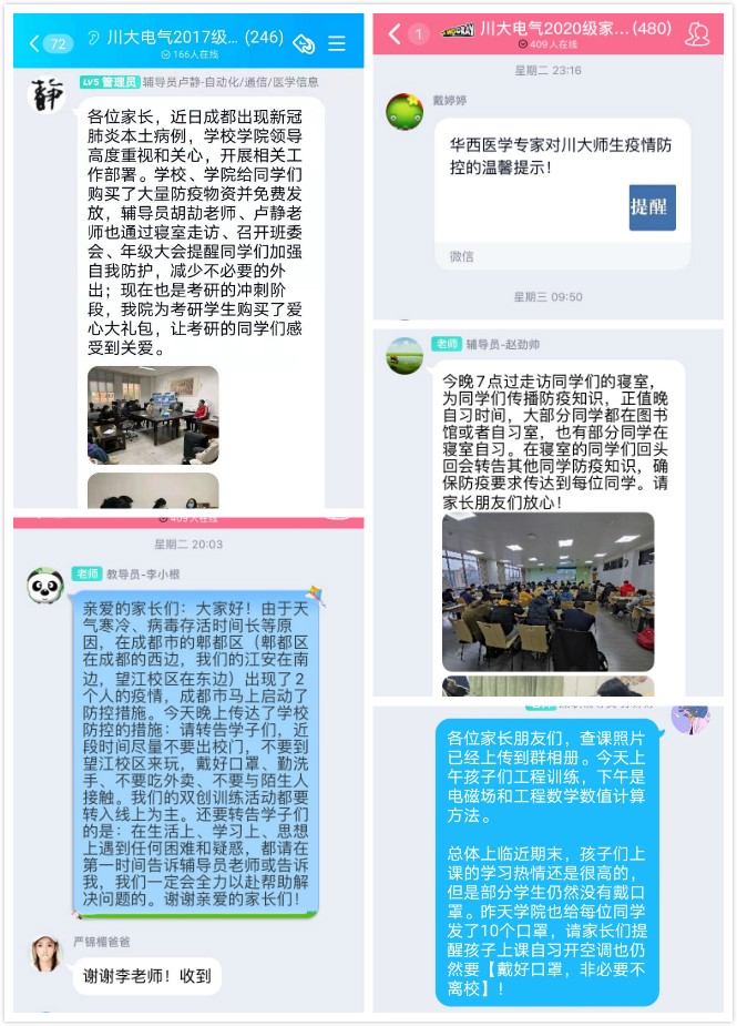 此外,学院注重家校联动,辅导员用活用好各年级家长群平台,及时通报成都最新疫情,传达学校学院各项防疫工作的开展情况,让远在外地的员工家长安心、放心。