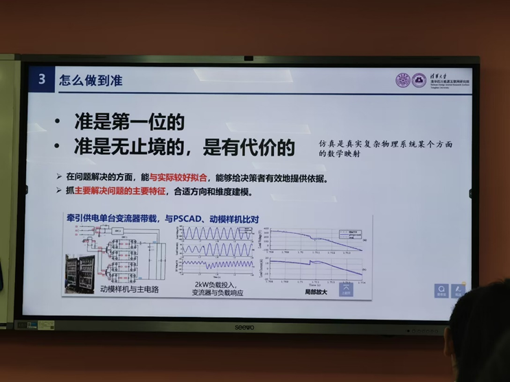 讲座中,张东辉工程师按照“仿真的目的”“如何评价仿真的好坏”“如何做到准与快”“新型电力系统稳定特点与仿真要求”“工程实践”五部分层层展开,逐层递进向同学们介绍了电力系统仿真中的要注意的关键问题,新型电力系统的“双高”特性为电力系统仿真带来的挑战以及张工所在团队完成的实践工作。