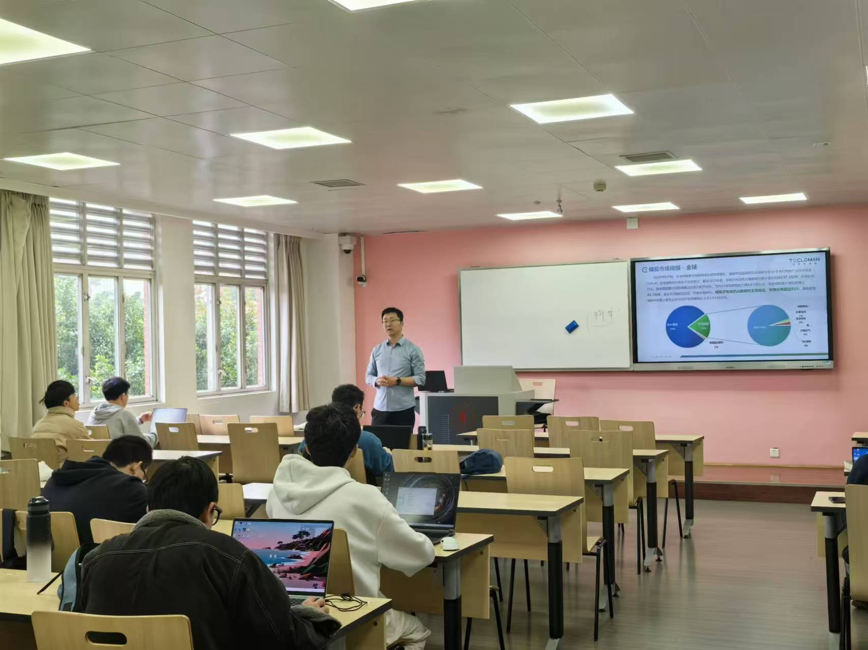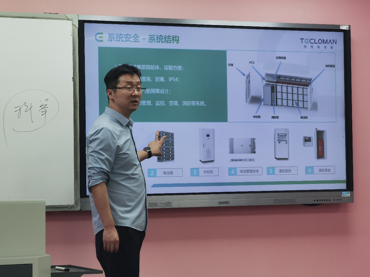 马总结合自身工作经历和目前储能行业的发展前景,为同学们生动地阐述了国内外储能市场规模、能源互联网、储能应用场景及需求分析、储能技术分类、储能系统关键技术问题以及储能设备结构和系统安全等内容。马总还从电池储能系统的结构——“3S+电芯”出发,重点讲解了电池管理系统(BMS)、能量管理系统(EMS)、储能变流器(PCS),深入浅出地向同学们展示了这三部分的结构和作用,让许多在毕业设计中涉及到储能规划的同学对储能的基本原理有了更加清晰的理解和认识。除此之外,马总在有关系统安全的设计思路更让同学们耳目一新,强调在未来研究与工程应用中需将设备可靠性置于首位,使研究内容与具体工程实际相结合,为解决复杂工程实际问题奠定基础。
