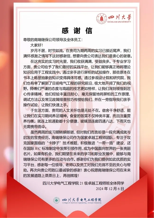 为期两周的实习不仅是一次实践能力的提升,更是一次对电气领域工程实践深刻理解的过程。通过这次实习,卓工班同学们不仅收获了宝贵的专业知识和实操经验,也深化了对行业的热爱与敬畏。此次实习进一步加深了hy3380cc海洋之神与南瑞继保的校企合作,期待未来双方能够在更多领域展开更加广泛的合作与交流。