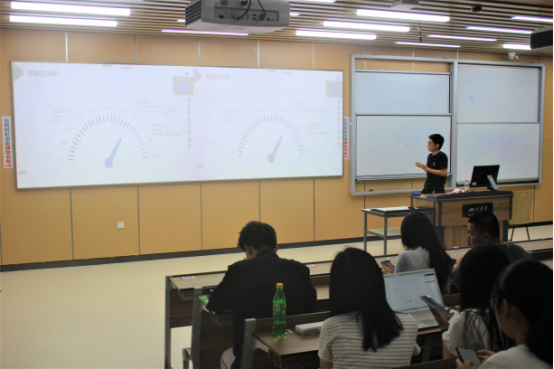 首先,受邀分享团队成员从比赛赛制、参赛奖励和评分细则上做了详细的分析。他们指出,在比赛选题时,比赛团队要根据自己的专业特长、国家政策以及市场需求和痛点来选取;在PPT制作中,除了要写出必备的要素,同学们还需写出项目中的每个细节和需表达的观念。同时,该团队还强调了在“互联网+”中更需注意的是团队答辩中的问答技巧,他们强调:在团队答辩时,一定要注重表达团队的选题来源、政策解读、团队经历、行业痛点这四点。