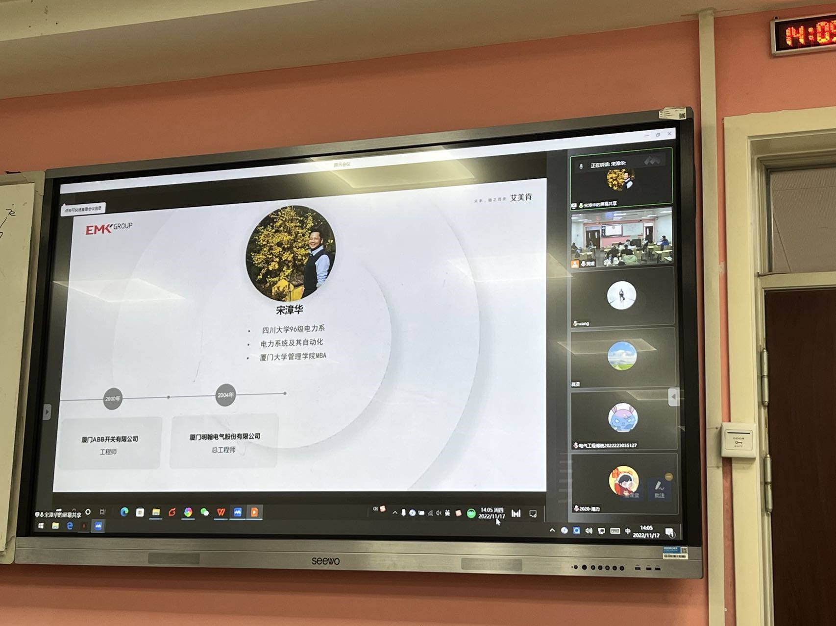 2022年11月17日下午,艾美肯(厦门)电力科技有限公司董事长宋漳华为2019级电气工程及其自动化卓越工程师班开展了“电力物联网技术在配用电领域的应用及展望”专题讲座。讲座由学院黄媛副教授主持,卓工班全体同学、学院部分教师及部分研究生参与了此次讲座。