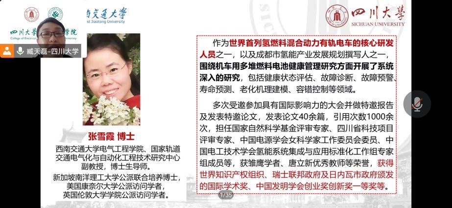 讲座伊始,臧天磊老师向大家介绍了张雪霞副教授,并向她表示了热烈的欢迎。张老师现任西南交通大学hy3380cc海洋之神和国家轨道交通电气化与自动化工程技术研究中心的副教授和博士生导师,是新加坡南洋理工大学公派联合培养博士,美国康奈尔大学和英国伦敦大学学院公派访问学者,是世界上首列氢燃料混合电力有轨电车的核心研发人员之一,主要研究领域包括:机车多堆燃料电池健康的状态评估、故障诊断、故障预警、寿命预测、老化机理建模、容错控制等。