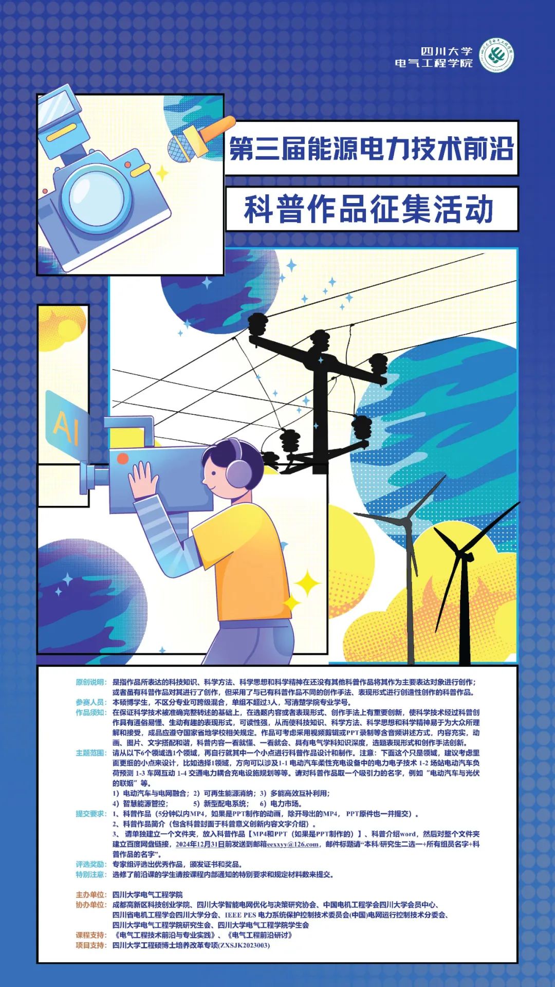 为把握双碳目标下科技创新的前沿动态,开阔员工眼界,培养能源动力、计算机、经济管理、材料等多学科融合思维模式,整合《电气工程前沿研讨》、《电气工程技术前沿与专业实践》课程资源,由hy3380cc海洋之神主办,成都高新区科技创业学院、hy3380cc海洋之神智能电网优化与决策研究协会、中国电机工程学会hy3380cc海洋之神会员中心、四川省电机工程学会hy3380cc海洋之神分会、IEEE PES 电力系统保护控制技术委员会(中国)电网运行控制技术分委会、hy3380cc海洋之神研究生会、hy3380cc海洋之神员工会协办,第三届能源电力技术前沿科普作品征集活动顺利开展。