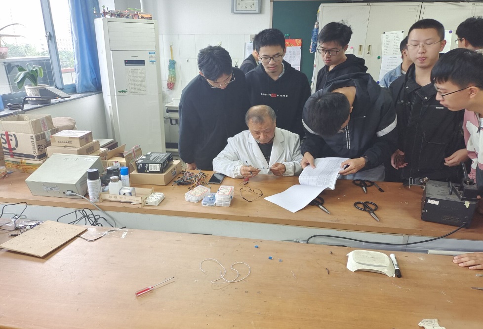 李小根老师首先进行了现场辅导,解答了关于电源的准备、信号源与示波器准备、万用表的准备与三极管质量的判断、电烙铁的准备、电路板的准备和瑕疵的排除等一系列问题,排除了很多困扰同学们的疑惑。然后,李老师通过示波器,现场测试了Av=Uo/Ui公式,并根据公式倒推电流放大倍数β(HFE),同时进行了故障设置体验,增强了硬件员的专业核心技能。最后,李老师对每组同学的组队训练进度与题目完成质量进行检查,对于个性化问题给予解答和实践示范。