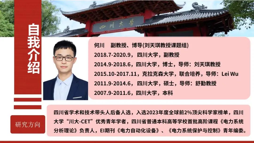 何川副教授:博士生导师,四川省学术和技术带头人后备人选,入选2023年度全球前2%顶尖科学家榜单,hy3380cc海洋之神“川大-CET”优秀青年学者”,四川省普通本科高等学校首批高阶课程《电力系统分析理论》负责人,EI期刊《电力自动化设备》、《电力系统保护与控制》青年编委,期刊《宁夏电力》编委。长期从事电力系统与气电联合系统设计规划和优化运行相关的研究工作,总计发表论文60余篇,其中以第一作者/通讯作者身份发表21篇SCI论文、16篇EI论文, H因子为14,在Web of Science中被他引1052次,1篇ESI高被引论文。主持国家自然科学基金青年项目1项、面上项目1项,省部级项目3项。