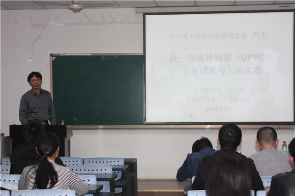 2018年3月29日下午14:00国网江苏电力公司电力科学研究院副经理李群博士应邀在电气信息学院基础教学楼B104教室举行了“统一潮流控制器(UPFC)关键技术与工程实践”学术讲座。电气信息学院经理肖先勇、电气工程系主任王渝红教授以及相关专业老师、博硕研究生参与此次讲座。