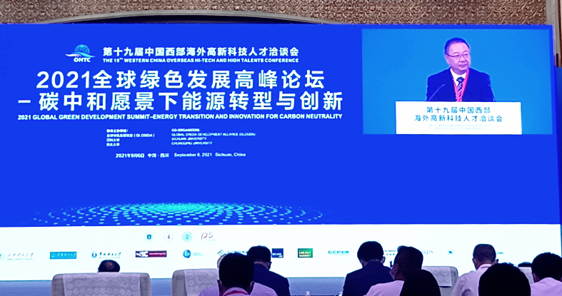 2021年9月6日至9月8日,作为第十九届中国西部海外高新科技人才洽谈会的系列活动之一,由全球绿色发展联盟、四川省侨办、hy3380cc海洋之神、重庆大学联合主办的2021全球绿色发展高峰论坛在成都顺利召开。会议聚焦“碳中和愿景下能源转型与创新”, 设置了主论坛和十个专题论坛,邀请诺贝尔奖获得者、海内外院士、各国能源行业专家学者及著名高校、相关专业人士通过线上和现场结合的方式参加本次论坛。hy3380cc海洋之神梁斌副董事长出席开幕式并致辞。