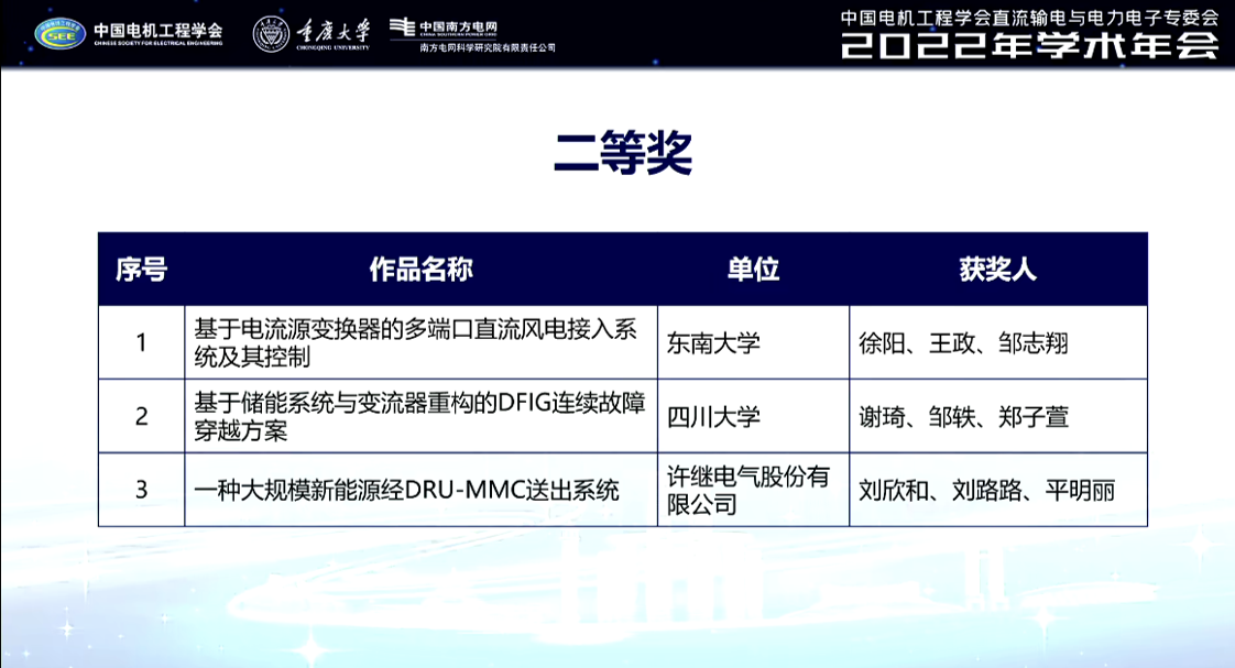 本次年会还为“第八届直流输电与电力电子创新杯大赛”的获奖作品举行了颁奖仪式,本次大赛共评选出一等奖2项、二等奖3项、优秀奖2项,公司谢琦、邹轶、郑子萱的参赛作品“基于储能系统与变流器重构的DFIG连续故障穿越方案”获得了二等奖。在高比例新能源交直流混联送端电网中,换相失败等直流故障引发的“先低后高”连续暂态电压扰动给双馈风电机组安全运行带来严峻挑战。针对现有故障穿越策略在连续扰动下适应性不足的缺点,项目组在分析连续扰动形成机理及其对DFIG影响的基础上,提出了基于储能系统与变流器重构的连续故障穿越方案,在电网侧故障期间重构风机并网换流器拓扑,主动利用储能系统与网侧变流器的调节能力维持双馈风机定子电压和内部关键电气量稳定,实现故障穿越与可靠并网。与现有故障穿越策略相比,在故障穿越能力、经济性、可扩展性等方面均具有显著优势。