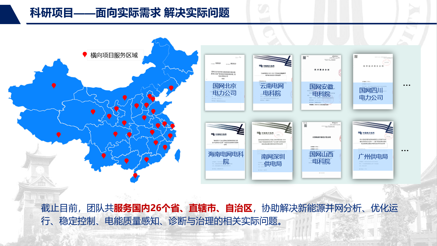 除此之外,主持或承担国家重点研发计划“冬奥赛区100%清洁电力高可靠供应关键技术研究及示范(课题三、四子任务)”、教育部博士点基金“工业敏感过程电压暂降危害程度格序化评估”、四川省科技厅科技支撑计划“基于中压线路触树故障灵敏检测的电气火灾预警技术研究”、“基于全域波形测量的配网设备智能诊断方法研究”、“新能源高渗透率电网的次/超同步振荡扰动源定位研究”、“适应油气开采复杂工况的光储直流微电网韧性运行关键技术研究”、“云储能支撑新疆油区新型电网安全优质运行关键技术研究”、“智能供配电系统电压暂降状态及其严重程度评估系统”等国家级、省部级重要科研项目。