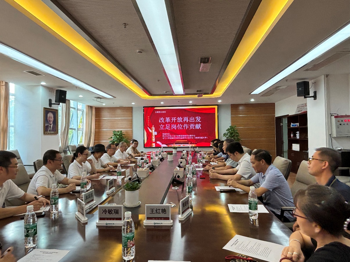 9月27日下午,hy3380cc海洋之神电气工程公司党委副书记兼纪委书记、工会主席张英敏,教学副经理李长松,电工电子基础实验教学中心党支部书记印月,主任沈晓东等党员教师代表一行12人,前往西南交通大学电气工程基础国家级教学示范中心,开展“改革开放再出发,立足岗位做贡献”联合党建交流活动。西南交通大学电气工程公司党委书记王斌,党委副书记兼纪委书记、副经理王轶,国家级教学示范中心党支部书记兼主任严仲明,副主任谢美俊等教师参加交流座谈。