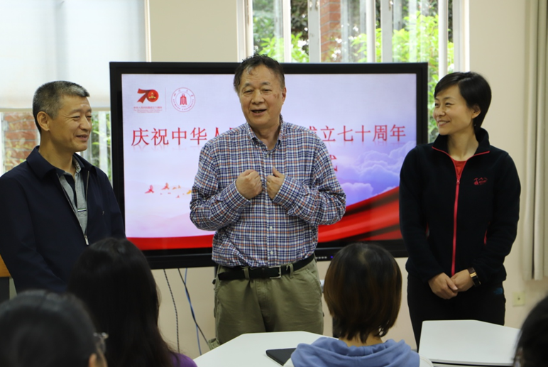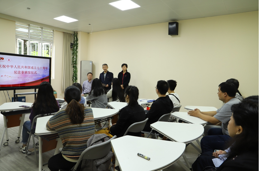 仪式伊始,韩书记首先介绍了尹可华老师曾获得国家科技进步二等奖,是老一代科技工作者为党和国家、为新中国的教育科研事业、为学院事业发展做出卓越贡献的典范,国家因尹老师所作出的突出贡献为尹老师颁发一枚“庆祝中华人民共和国成立70周年”纪念章。我们要以尹可华老师为榜样,发扬奋斗精神,把个人的发展与国家的民族复兴大业紧密联系在一起,为中华民族伟大复兴贡献力量。