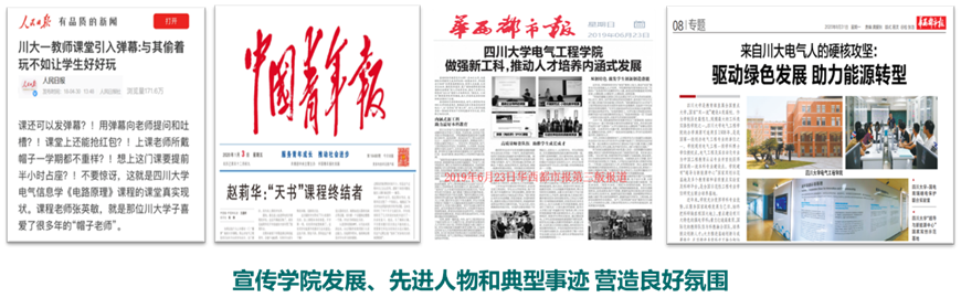 正向牵引,营造氛围强动力。公司牢牢把握意识形态工作主动权,对学院内涵式发展育人思想和做法、先进人物和典型事迹第一时间进行宣传报道,近年来在《中国青年报》、《华西都市报》、《封面新闻》等国家级和省级媒体报道17篇次,校院媒体平台发布新闻年均200余篇,有效助力学科评估和一流专业、一流课程申报,为学院赢得良好社会声誉,并在全院营造了“比学赶帮超”积极向上的良好氛围。