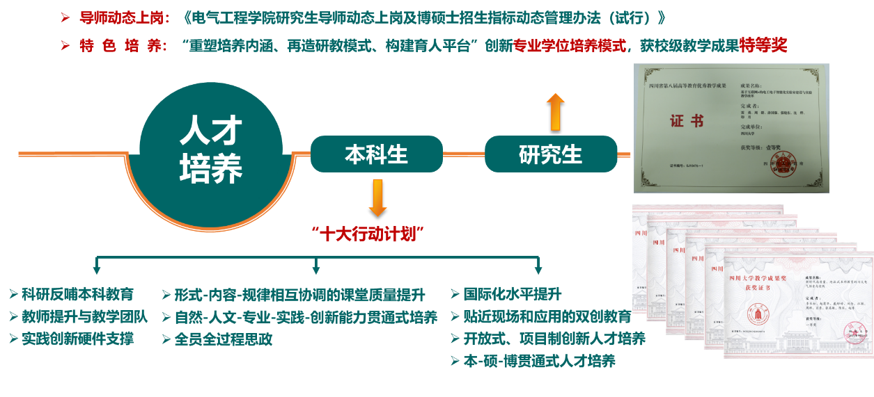 这十年,学院着力优化调整学科专业,明确以电气工程和控制科学与工程两个一级团队建设为核心。2018年以来,每年召开团队建设发展咨询理事会,邀请10余位院士、20余位行业专家每年围绕学院重点工作确定主题召开会议,为学院发展建言献策。学院抢抓发展机遇,凝练学科特色,形成了以“水-风-光-氢-电-气-储”综合能源、交直流输配电系统稳定与控制、能源电力系统数字化智能化、电力扰动与优质供电、先进能源电气材料与装备等为特色的电气工程学科方向,以及以先进感知与自主控制、智能检测与自动化装置、医学人工智能等为特色的控制科学与工程学科方向,具有川大风格的电气学科特色愈发鲜明。