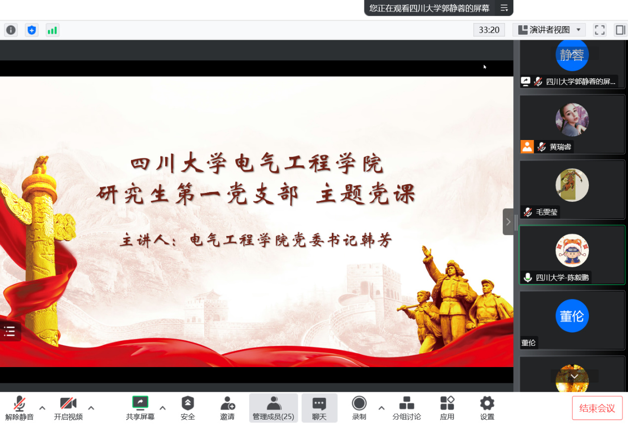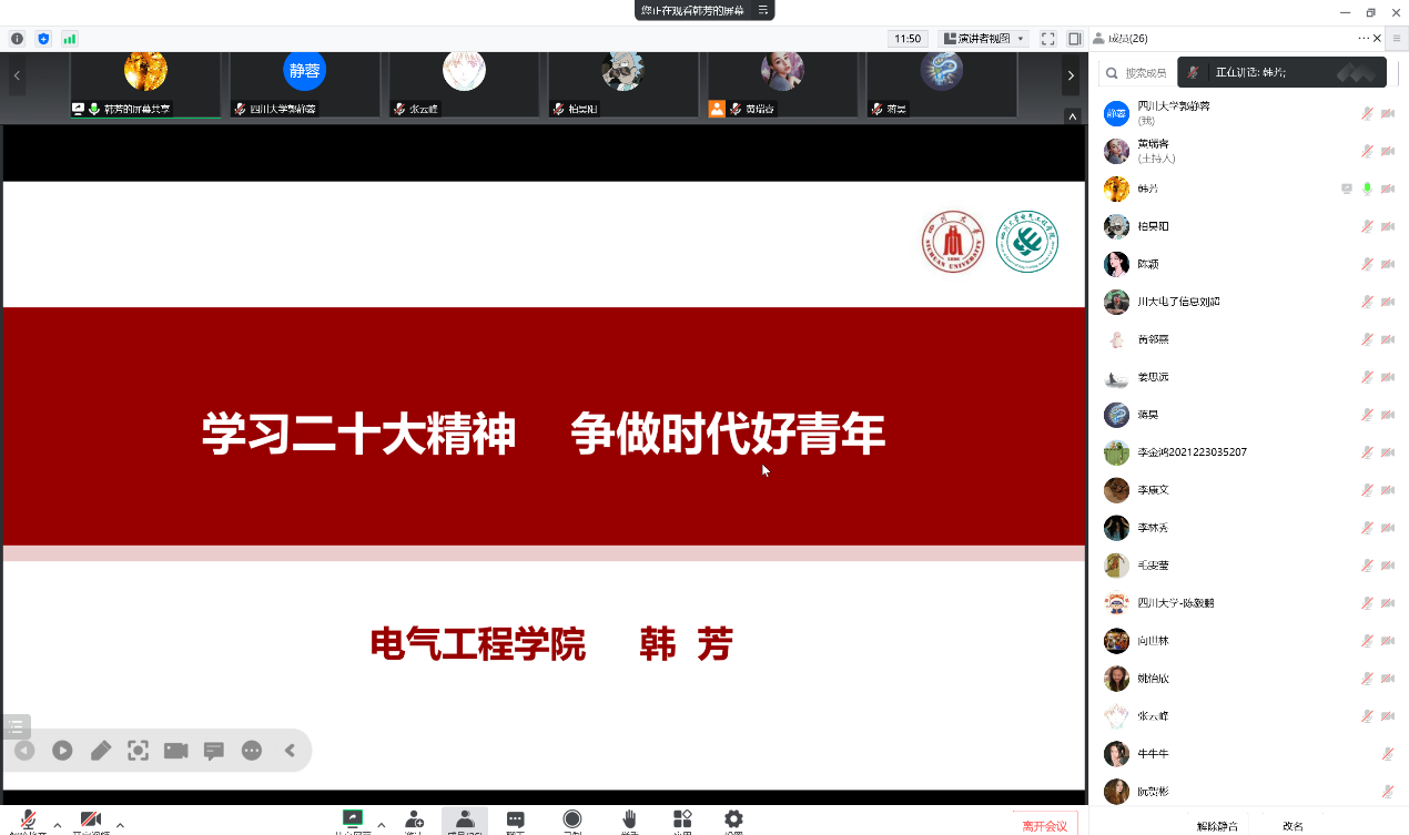 为深入学习贯彻党的二十大精神,激励同学们做有理想、敢担当、能吃苦、肯奋斗的新时代好青年。12月18日下午,hy3380cc海洋之神电气工程公司党委书记韩芳以“学习二十大精神,争做时代好青年”为主题,为学院研究生第一党支部讲授专题党课,党课通过腾讯会议线上举行。由支部宣传委员郭静蓉同志主持,支部全体党员同志及入党积极分子参加了本次活动。