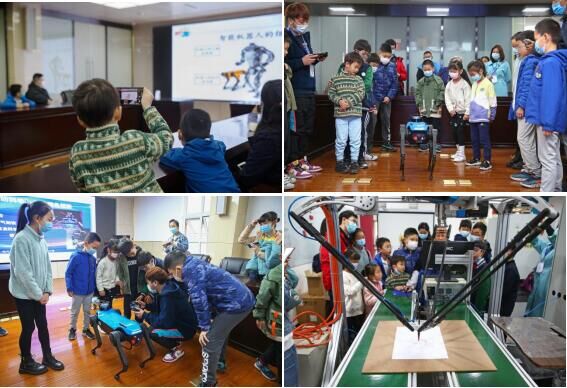 在罗克韦尔自动化实验室,“乐动机甲” 活动首先播放了hy3380cc海洋之神火锅战队参加“全国RM机甲大赛复活赛”的精彩视频,再现了RM机甲大赛的立体化战斗场面。在参赛同学的讲解下,小朋友们明白了比赛规则,理解了机器人的各项运动功能。随后,工作人员邀请了部分小朋友近距离接触4号战斗机器人,并进行了简单操控。现场不断爆发出孩子们惊叹声和欢笑声,在欢乐刺激的氛围下激发了科学兴趣,启蒙了科学智慧。“智能机器狗活动”在五楼能源互联网实验室开展。现场首先由研究生讲解了智能机器人的概念,目前国内外的发展趋势和应用示例。在此基础上,进行了智能机器狗Mini的现场表演。机器狗的每一次动作,无论是快速行走、跳跃障碍和原地翻滚都引起了小朋友们的阵阵喝彩。最后孩子们还亲身体验操控机器狗,感受人工智能的魅力。“工业机器人展示”环节中主要由工作人员操控三臂机器人进行绘画表演、工业机械臂的路径规划演示、四旋翼无人机展示等。