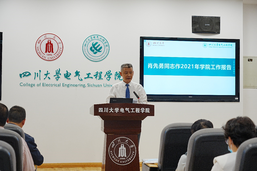 经理肖先勇作2021年学院工作报告。在报告中,肖经理回顾和总结了2021年全院工作,并提出下一阶段工作重点。他讲到,过去一年,学院坚持以习近平新时代中国特色社会主义思想为指导,以教师发展和员工发展为中心,认真落实立德树人根本任务,以高质量党建引领学院事业高质量发展,在确保新冠疫情常态化防控的同时,实现了“十四五”和第二轮“双一流”建设的良好开局,在党建事业、人才培养、科学研究与学科发展等方面成绩卓然,全院师生自豪感、幸福感和成就感进一步提升,开启了学院发展的新篇章。肖经理结合学院实际,提出学院下一阶段建设发展工作总思路,指出学院将在团队队伍建设、科学研究发展、人才培养质量、治院办学能力等方面继续不懈努力、争创一流。